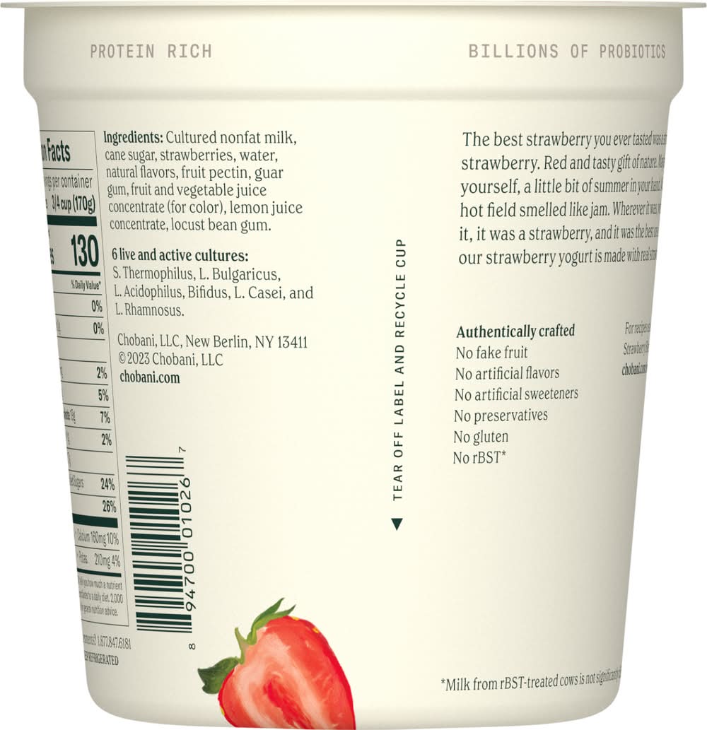 Non-fat greek yogurt. No artificial flavors. Non-fat No gluten Protein rich Billions of probiotics. No artificial sweeteners. • Flavor: Strawberry • Chobani, LLC, New Berlin, NY, 13411
