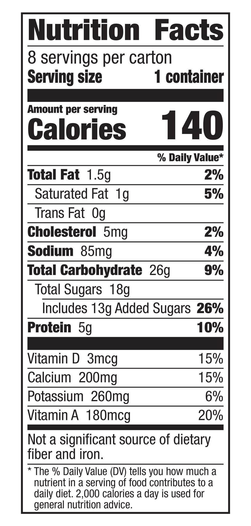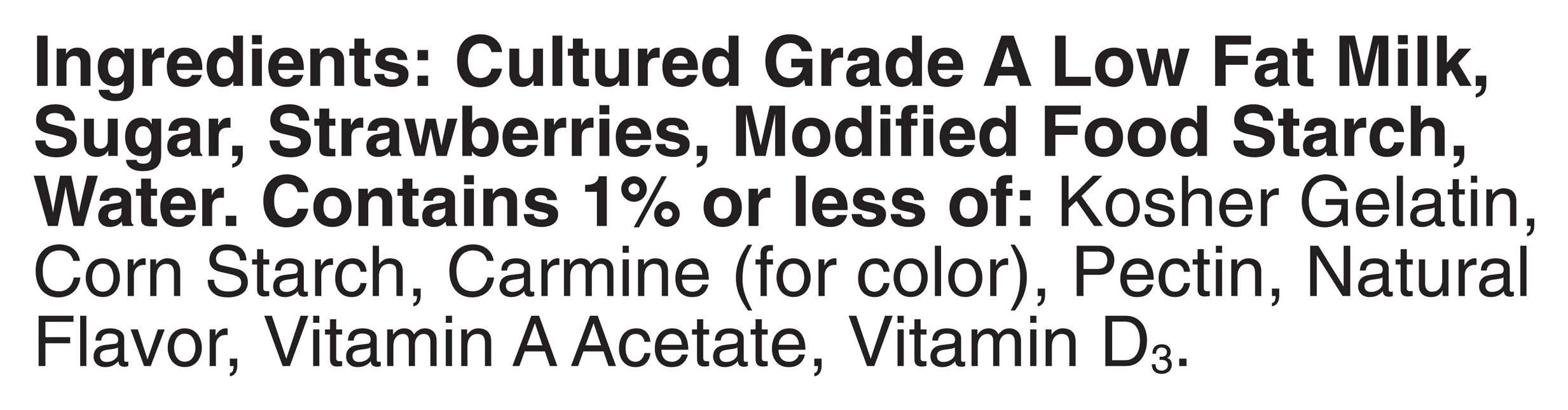 Ingredients: Cultured Grade A Low Fat Milk, Sugar, Strawberries, Modified Food Starch, Water, Contains 1% or Less of: Kosher Gelatin, Corn Starch, Carmine (for Color), Pectin, Natural Flavor, Vitamin A Acetate, Vitamin D3 Contains: Milk