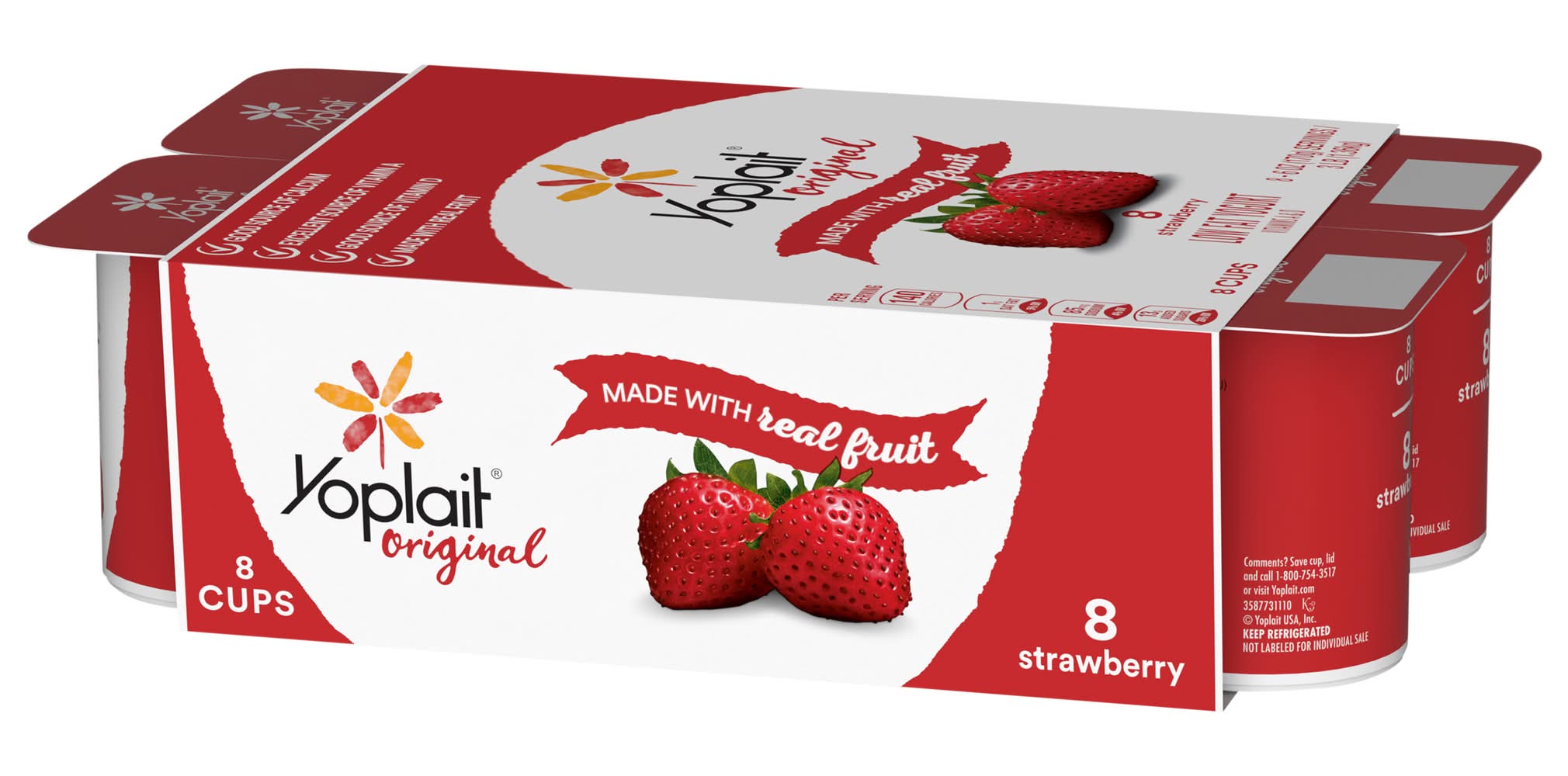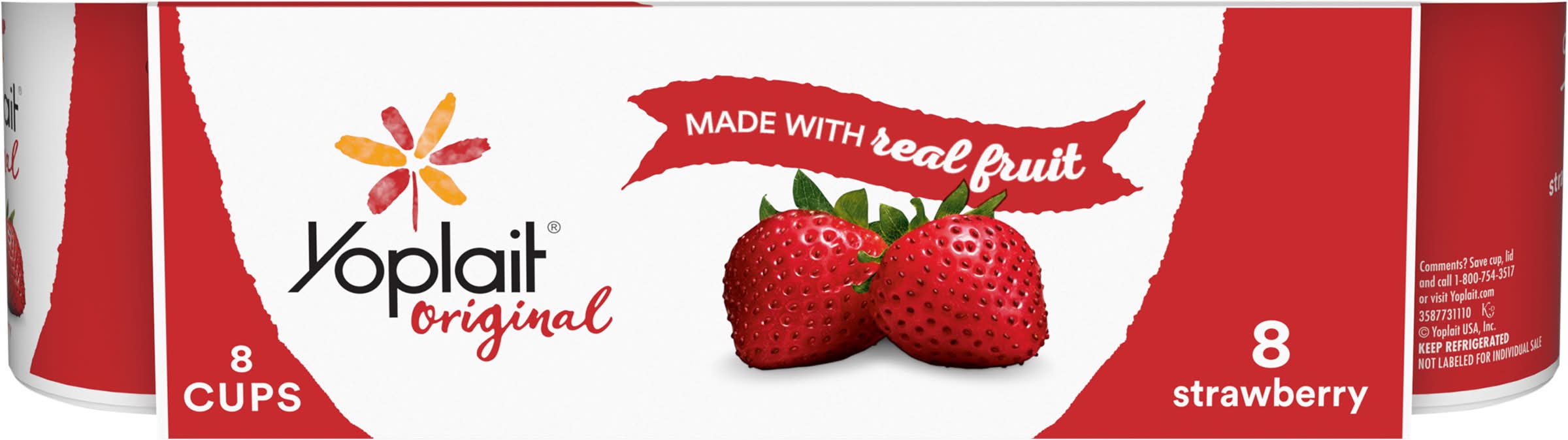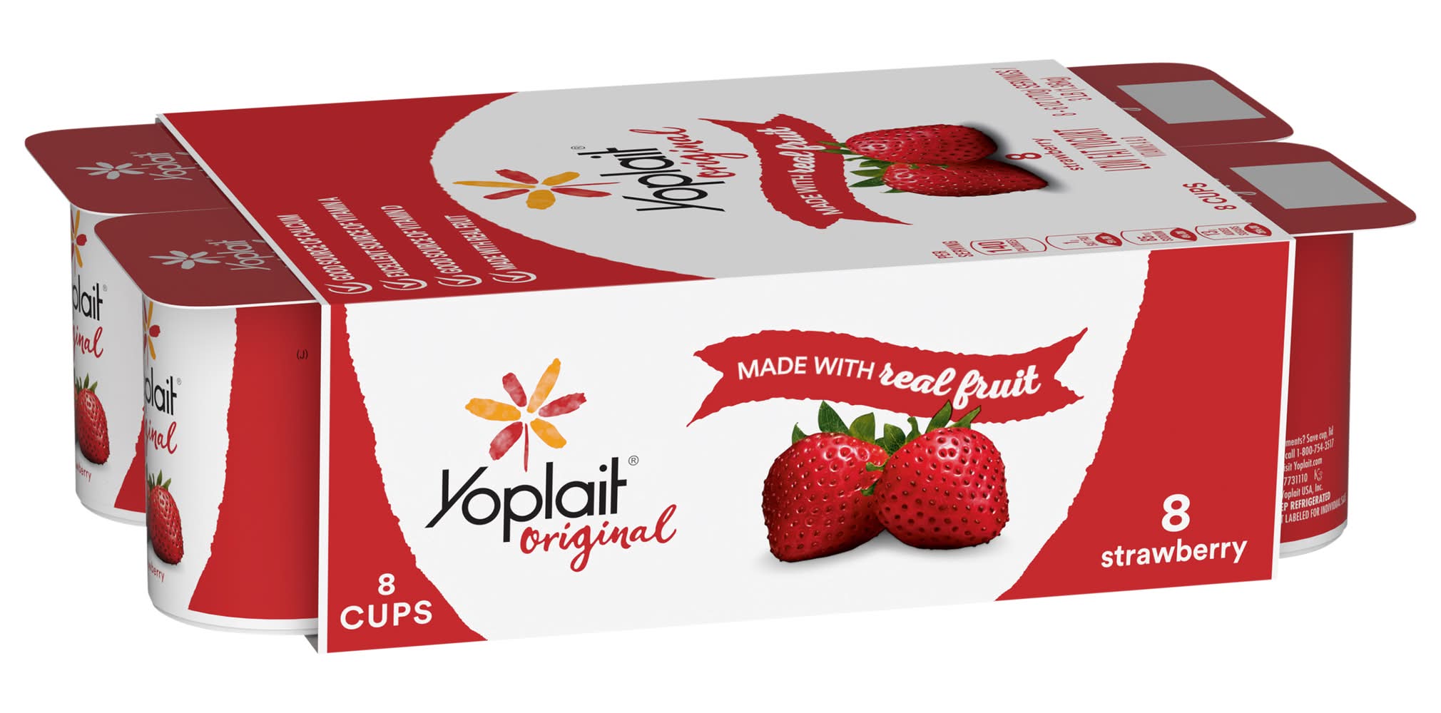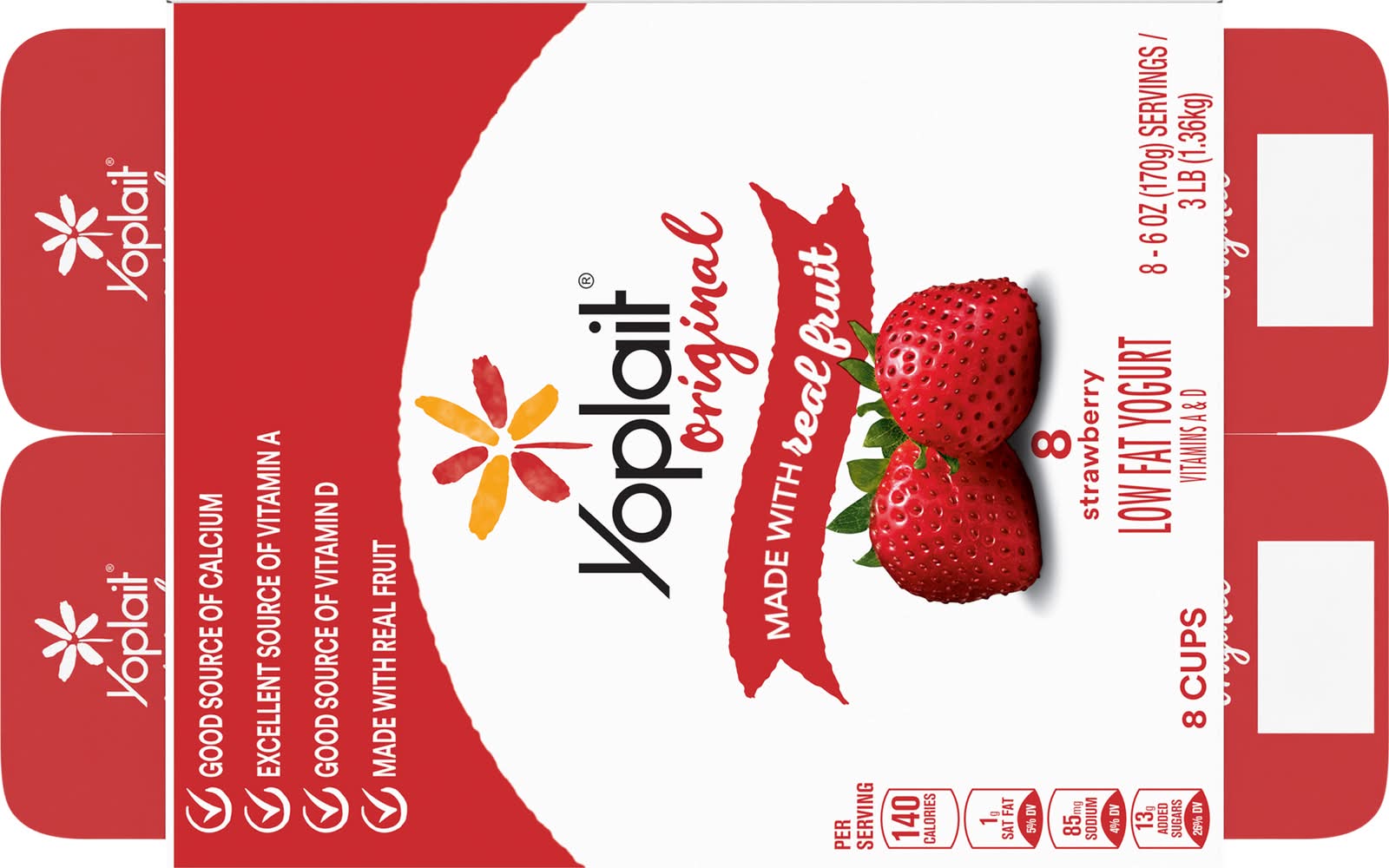 Delicious addition to an easy breakfast or snack! Made with real fruit plus live and active yogurt cultures, there are no artificial flavors or colors from artificial sources, and no high fructose corn syrup. Each serving is a good source of calcium and vitamin D, an excellent source of vitamin A, and is gluten free. Enjoy the yogurt plain, pair it with granola, or blend into a refreshing strawberry yogurt smoothie. Make it a tasty alternative to Greek yogurt. Grab a convenient yogurt cup as a part of breakfast to go. Or stock up for quick snacks for the family. Also try our other varieties, such as low fat French vanilla yogurt and low fat mixed berry yogurt. Store Yoplait Yogurt in the refrigerator and keep cold until you're ready to grab a spoon and enjoy. Yoplait brings goodness to everyday moments, one serving of yum at a time. • Flavor: Strawberry • Pack size: 8 • Yoplait USA, Inc., Box 200 YC, Mpls, MN, 55440, USA • Packaging: Reusable
