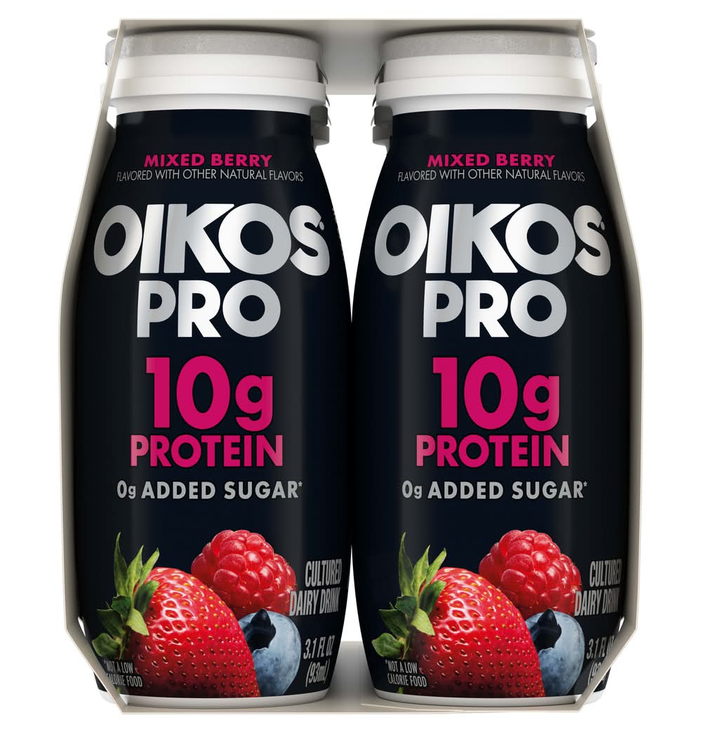 Go Pro with Oikos Pro Shots Mixed Berry Cultured Dairy Drink, the anytime snack with more of what you want and less of what you don’t. Every 3.1 fl oz serving contains 9 essential amino acids, in addition to vitamins B2, B6 and B12. There’s 0g of added sugar* per 3.1 fl oz serving, and no artificial flavors or colors from artificial sources. Our cultured dairy drink packs a punch with 10g of protein, so you can always have dependable, high protein snacks to help you add more protein to your day. Because when you feel strong, you are unstoppable. With complete protein and deliciousness, these snacks can help you strive to reach your potential with every serving. Protein is important - an essential nutrient that we need in our diet - and Oikos Pro cups are great tasting, convenient solutions for adding complete protein every day. Grab these on the go snacks for days that start at a sprint, enjoy a delicious boost of protein at lunch, add a creamy boost to your protein shake, or pack a bottle for a protein boost for your workout for a customizable daily protein routine. For more reasons to go Pro, Oikos Pro snack cups have you covered with 20g of protein per 5.3 oz serving. Need 0g added sugar,* 0 artificial sweeteners, and 0% fat? Try Oikos Triple Zero with 15g of protein per 5.3 oz serving. Oikos — Stronger Makes Everything Better (R). *Not a low-calorie food. • Flavor: Mixed berry • Pack size: 6 • Packaging: Reusable