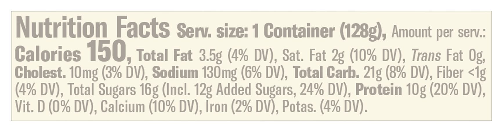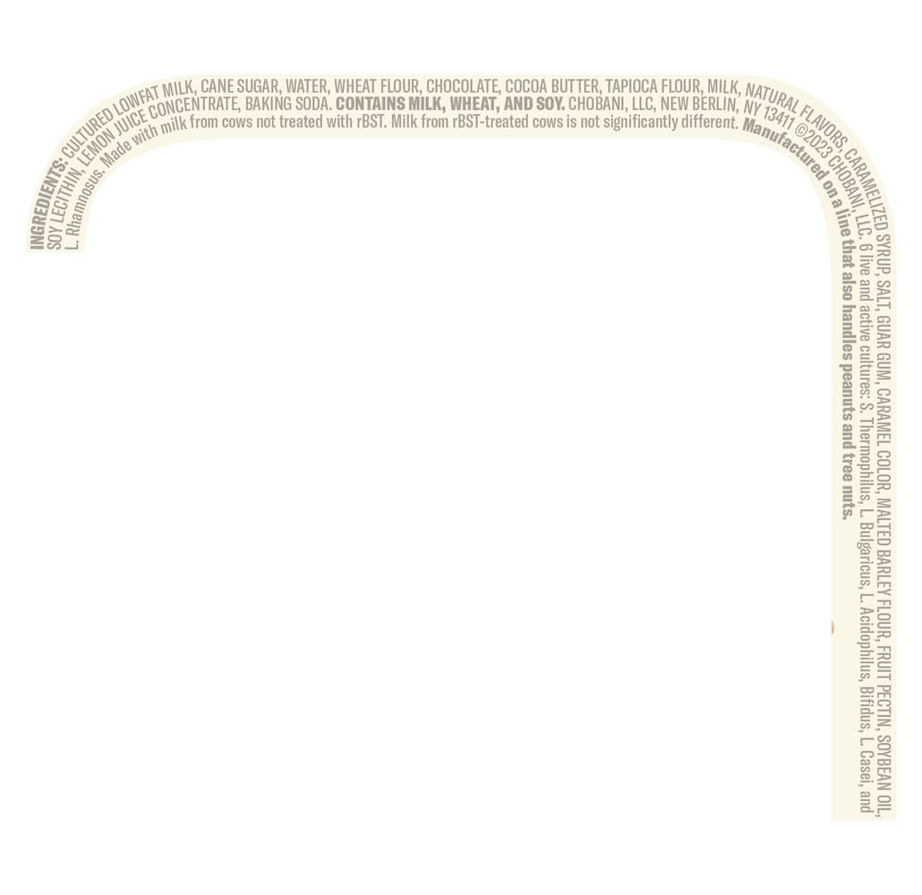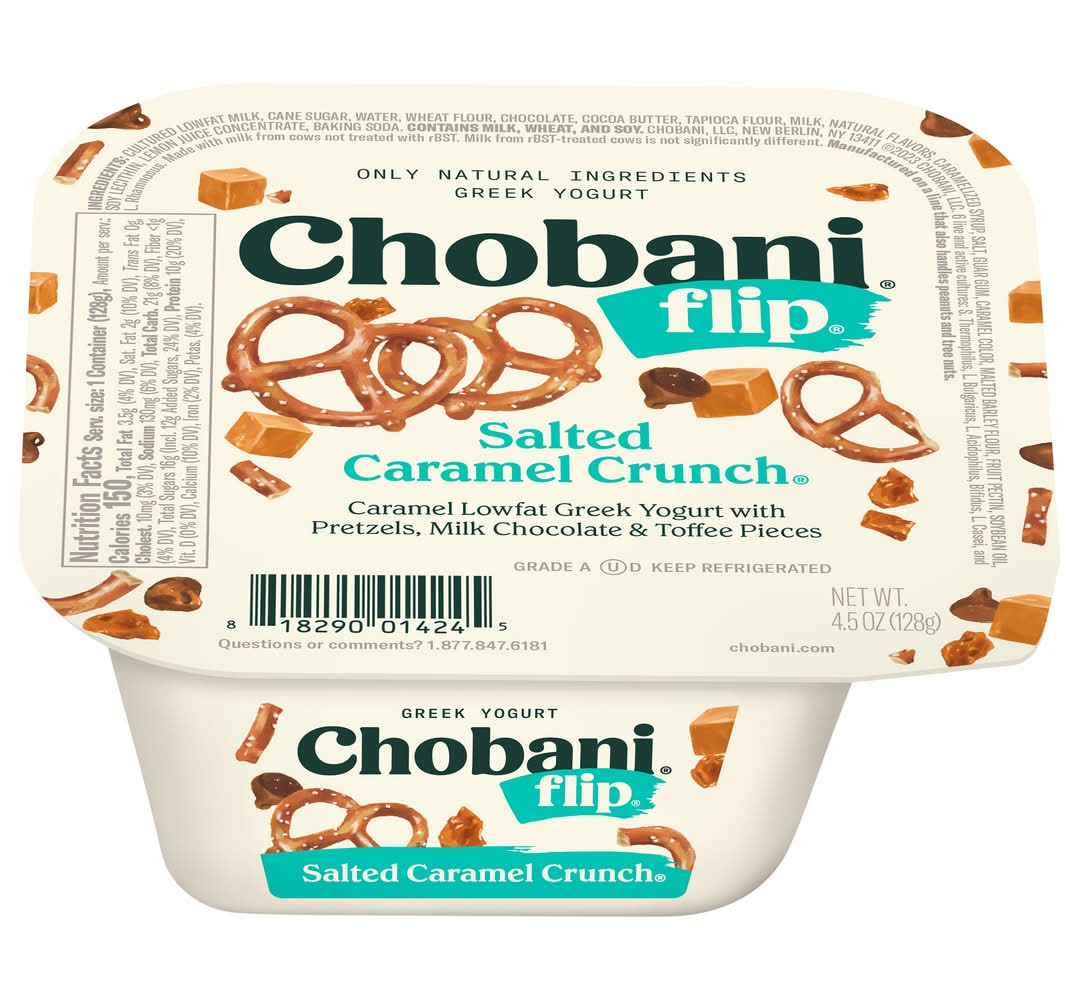 Caramel Lowfat Greek yogurt with pretzel, milk chocolate & toffee pieces. Made with milk from cows not treated with rBST. Milk from rBST-treated cows is not significantly different. Grade A. • Flavor: Salted caramel crunch • Chobani, LLC, New Berlin, NY.