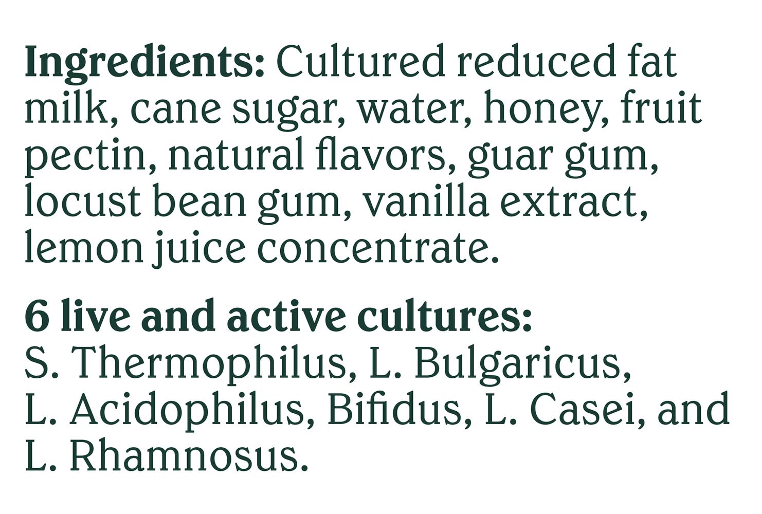 Ingredients: Cultured Reduced Fat Milk, Cane Sugar, Water, Honey, Fruit Pectin, Natural Flavors, Guar Gum, Locust Bean Gum, Vanilla Extract, Lemon Juice Concentrate. 6 Live and Active Cultures: S. Thermophilus, L. Bulgaricus, L. Acidophilus, Bifidus, L. Casei, and L. Rhamnosus Contains: Milk