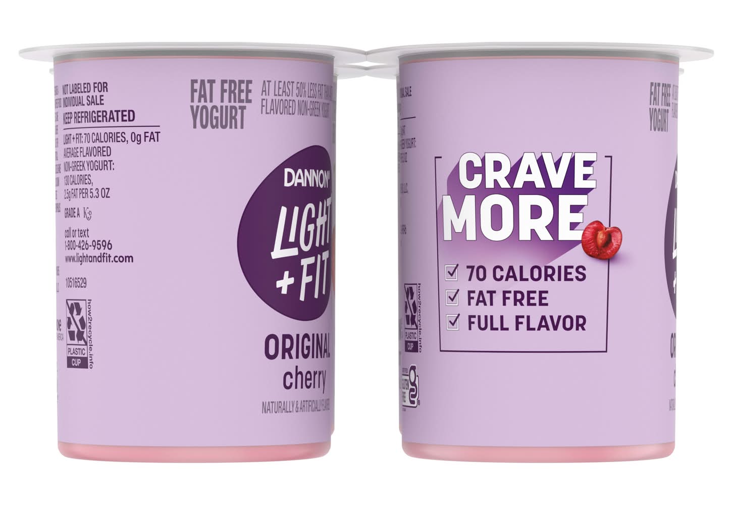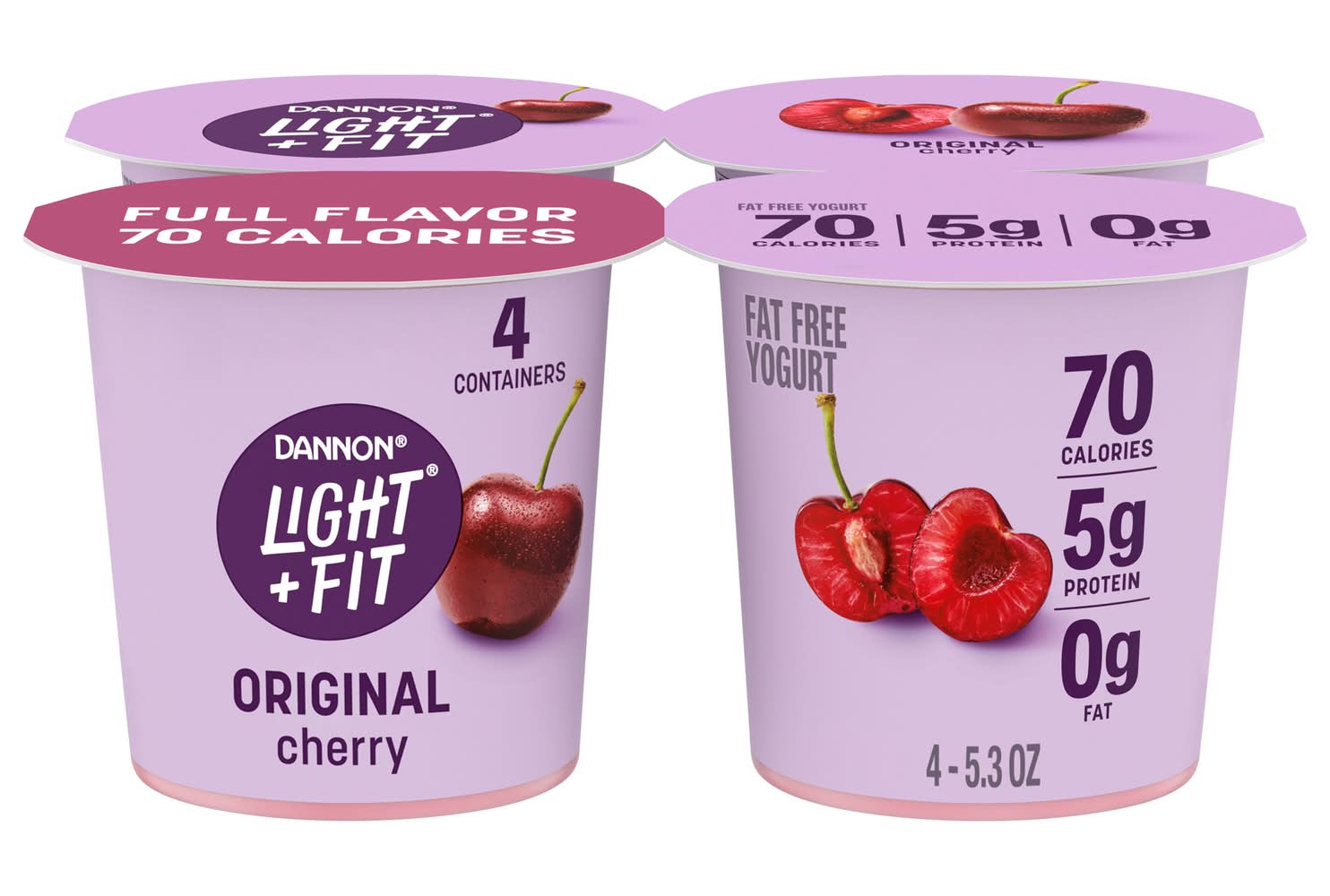 Looking for a delicious nonfat yogurt with creamy cherry flavor? Give your taste buds a reason to rejoice with a 4-pack of Dannon Light + Fit Cherry Original Nonfat Yogurt Cups. Every bite of this cherry flavored yogurt makes it easy to love healthy snacks with this delicious light yogurt brand.* At Light + Fit, we serve balanced healthy snacks packed full of delightfully creamy yogurt so you can be your best self. Our nonfat yogurt comes in a cup so you can enjoy a serving anytime as a snack at work or as a late-night healthy snack. With 70 calories and 5g of protein per serving, it’s a delicious, convenient option that can help you stick to a healthy routine. You can add a cup to your breakfast parfaits and yogurt smoothies or use some in your favorite recipes as a flavorful substitute for baking ingredients. Add some joy to your day, every day, with Light + Fit Cherry Original Nonfat Yogurt. *At least 50% less fat than average flavored non-Greek yogurt. Light + Fit: 50-60 calories, 0g fat; Average flavored non-Greek yogurt: 100 calories, 2g fat per 4 oz. • Flavor: Cherry • Pack size: 4 • Danone US, LLC, White Plains,NY,10605