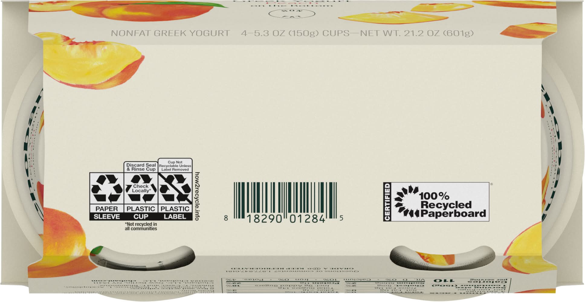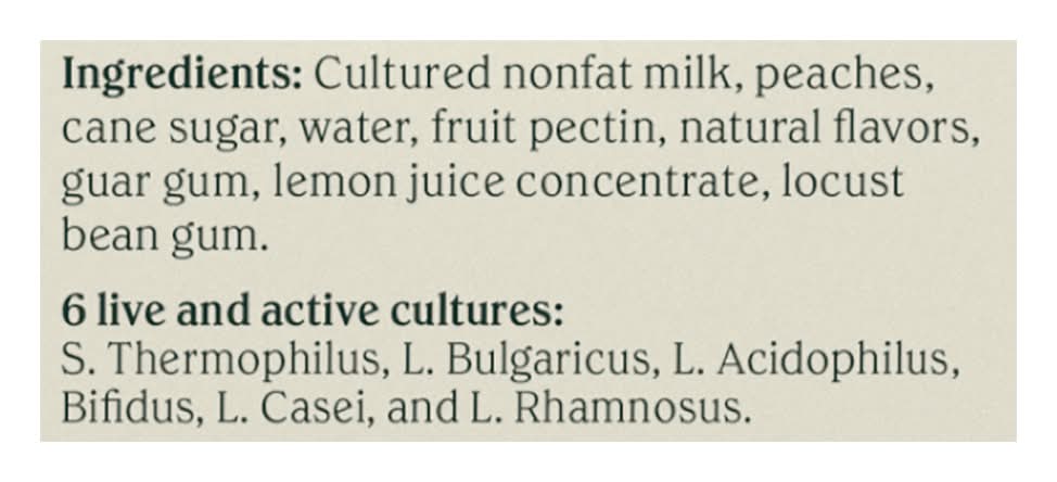 Ingredients: Cultured Nonfat Milk, Peaches, Cane Sugar, Water, Fruit Pectin, Natural Flavors, Guar Gum, Lemon Juice Concentrate, Locust Bean Gum. 6 Live and Active Cultures: S. Thermophilus, L. Bulgaricus, L. Acidophilus, Bifidus, L. Casei, and L, Rhamnosus Contains: Milk