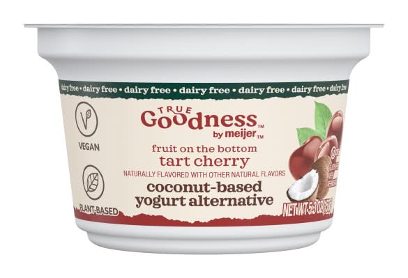 True Goodness Coconut Milk Yogurt is a Greek-style, plant-based yogurt that features fruit at the bottom. It is thick and creamy and contains probiotics, enhancing its nutritional profile.
