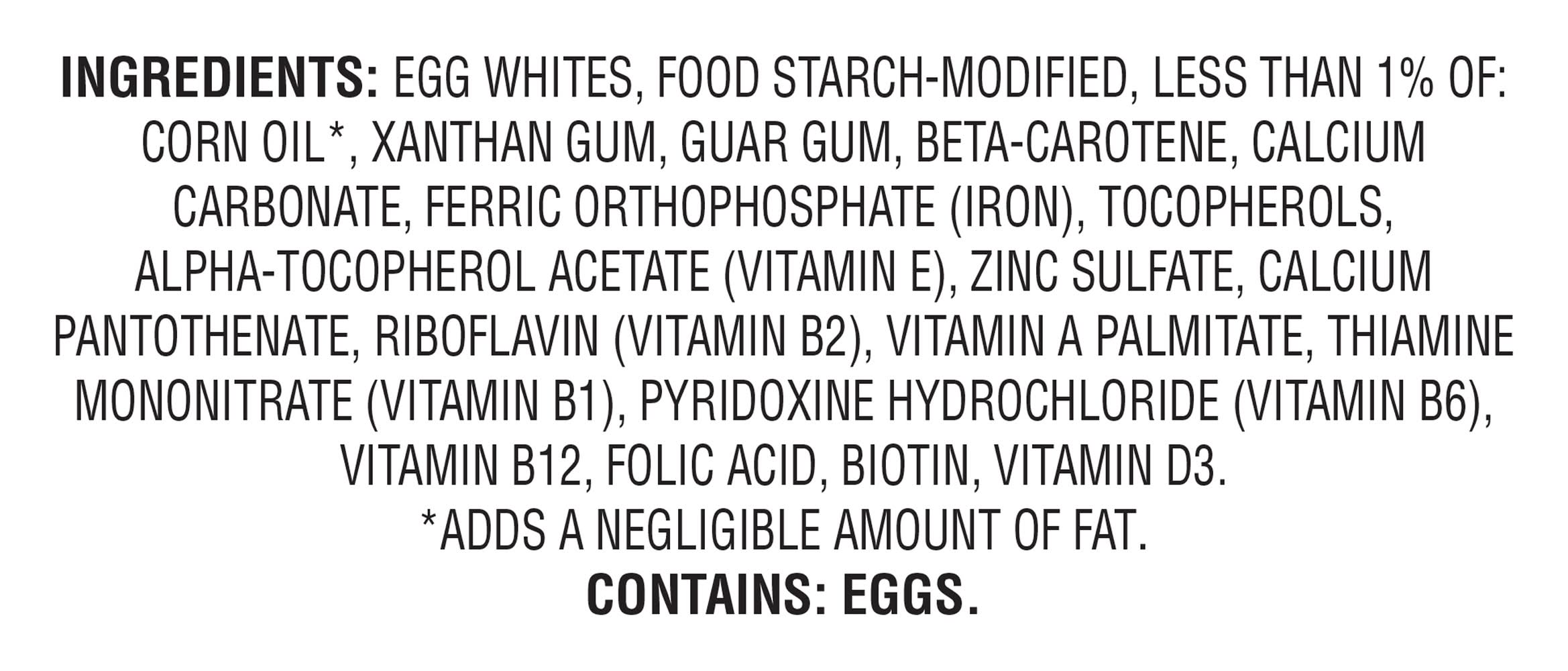 Ingredients: Egg Whites Less than 1% of: Xanthan Gum Guar Gum Color (Includes Beta Carotene) Vitamins and Minerals: Calcium (Sulfate), Iron (Ferric Orthophosphate) Vitamin E Alpha Tocopherol Acetate) Zinc Sulfate), Calcium Pantothenate Vitamin B2 (Riboflavin) Vitamin A Palmitate Vitamin B1 (Thiamine Mononitrate), Vitamin B6 (Pyridoxine Hydrochloride) Vitamin B12 Folic Acid Biotin Vitamin D3. Contains: Eggs