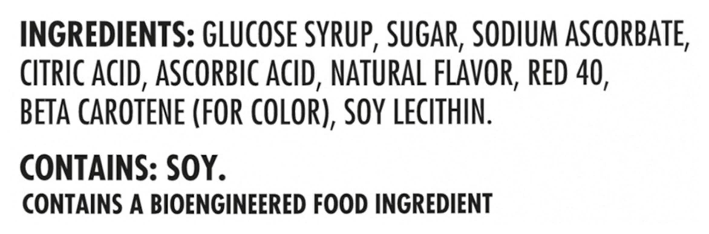 Ingredients: Glucose Syrup, Sugar, Sodium Ascorbate, Citric Acid, Ascorbic Acid, Natural Flavor, Red 40, Beta Carotene (for Colors), Soy Lecithin Contains: Soybeans, Soy