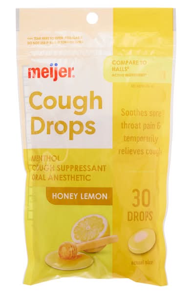 Meijer Honey-Lemon Cough Drops offer a soothing honey lemon flavor designed to alleviate sore throat pain and temporarily relieve cough symptoms. These drops are suitable for moments when relief from throat discomfort and coughing is needed.