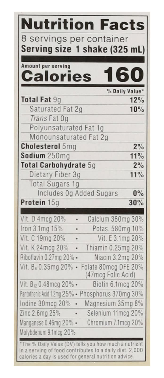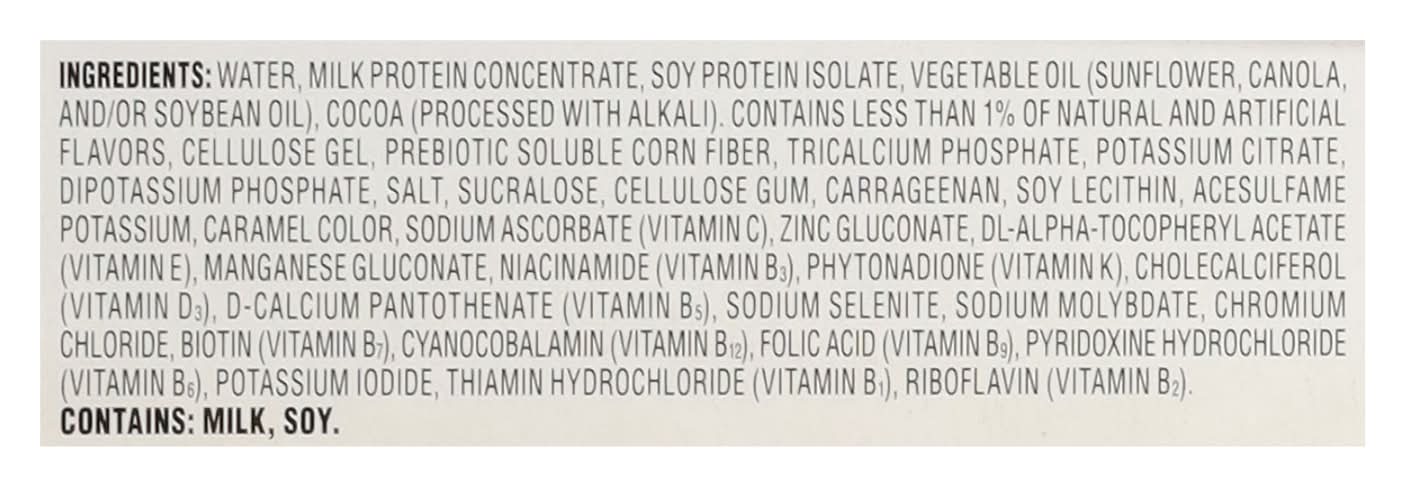 Ingredients: Water, Milk Protein Concentrate, Soy Protein Isolate, Vegetable Oil (Sunflower, Canola, and/or Soybean Oil), Cocoa (Processed with Alkali), Contains Less than 1% of Natural and Artificial Flavors, Cellulose Gel, Prebiotic Soluble Corn Fiber, Tricalcium Phosphate, Potassium Citrate, Dipotassium Phosphate, Salt, Sucralose, Cellulose Gum, Carrageenan, Soy Lecithin, Acesulfame Potassium, Caramel Color, Sodium Ascorbate (Vitamin C), Zinc Gluconate, DL-Alpha-Tocopheryl Acetate (Vitamin E), Manganese Gluconate, Niacinamide (Vitamin B3), Phytonadione (Vitamin K), Cholecalciferol (Vitamin D3), D-Calcium Pantothenate (Vitamin Bs), Sodium Selenite, Sodium Molybdate, Chromium Chloride, Biotin (Vitamin B7), Cyanocobalamin (Vitamin B12), Folic Acid (Vitamin B9), Pyridoxine Hydrochloride (Vitamin B6), Potassium Iodide, Thiamin Hydrochloride (Vitamin B1), Riboflavin (Vitamin B2) Contains: Milk, Soybeans, Corn