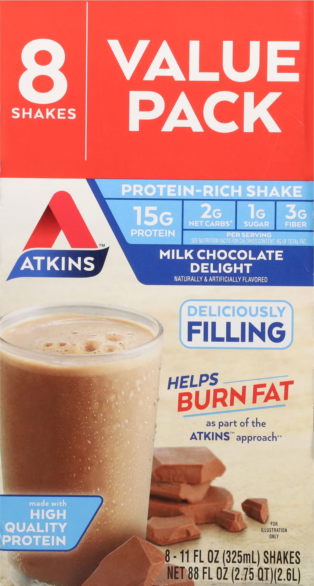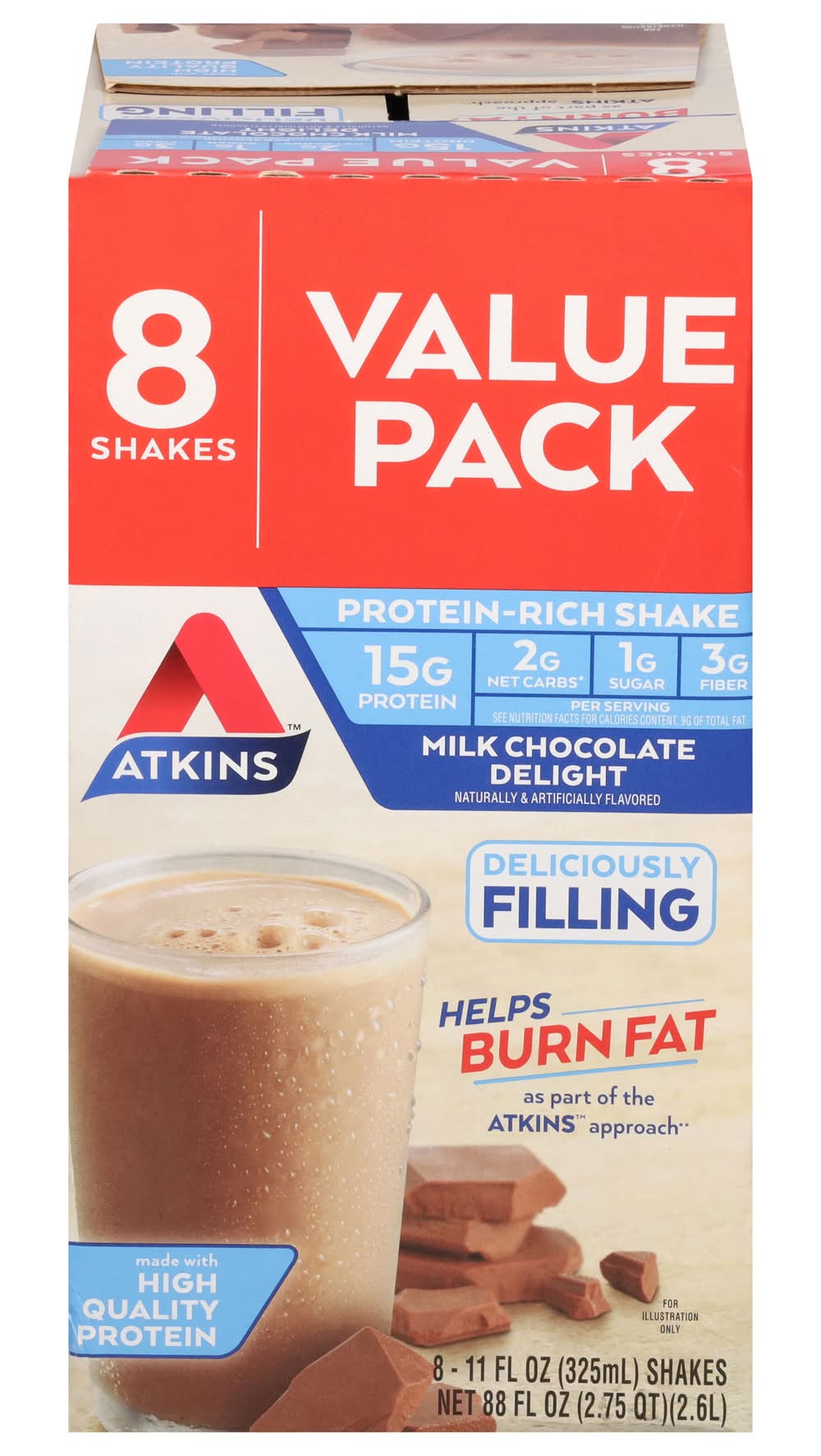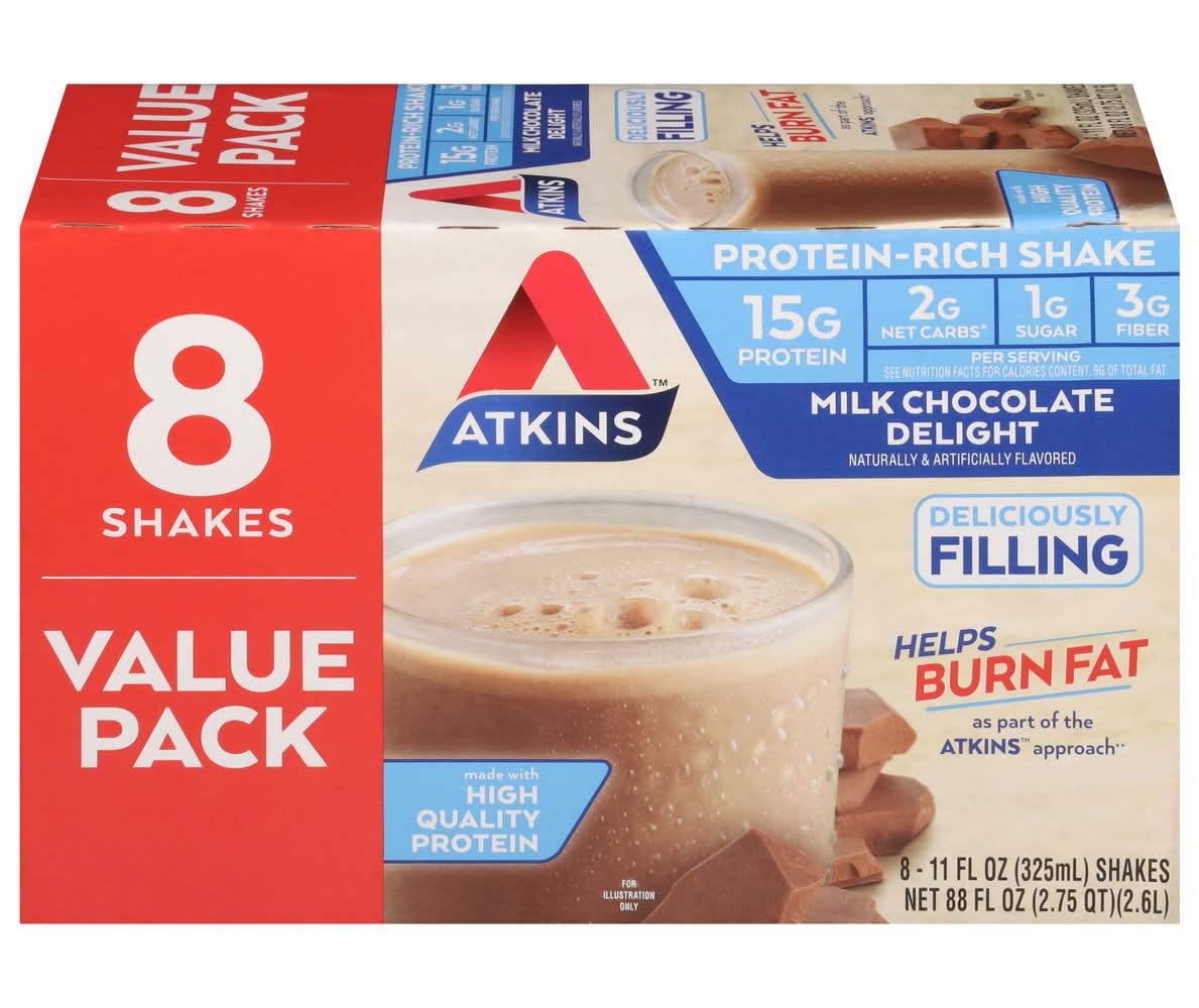 Protein-Rich Shake, Milk Chocolate Delight, Value Pack • Pack size: 8 • Atkins Nutritionals, Inc., Denver, CO, 80202 • Packaging: Reusable