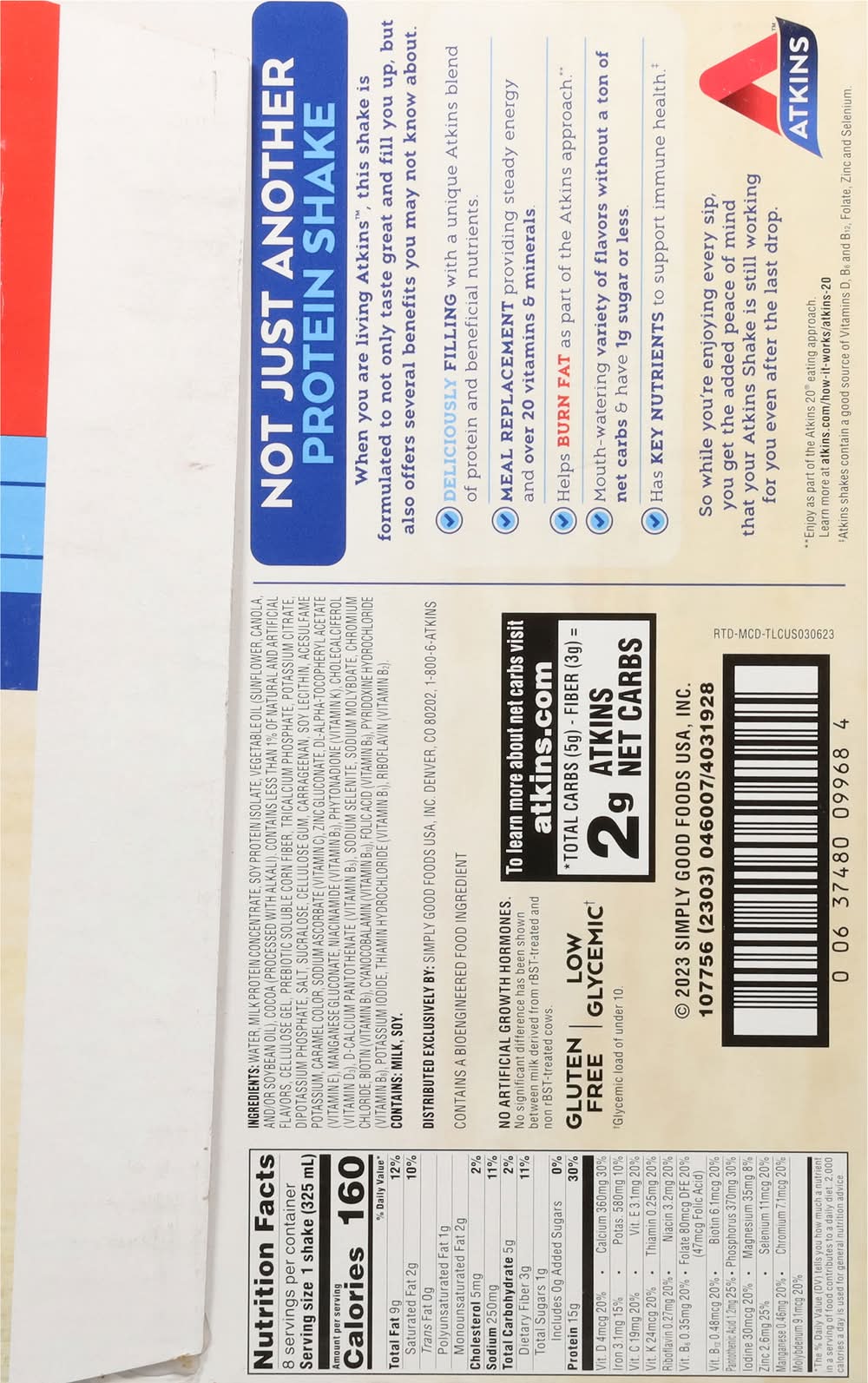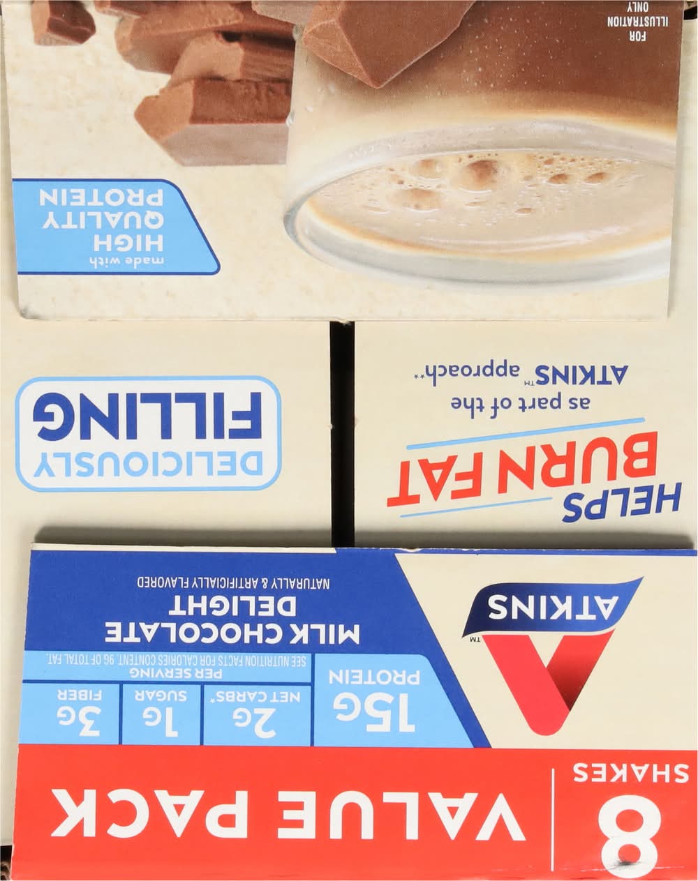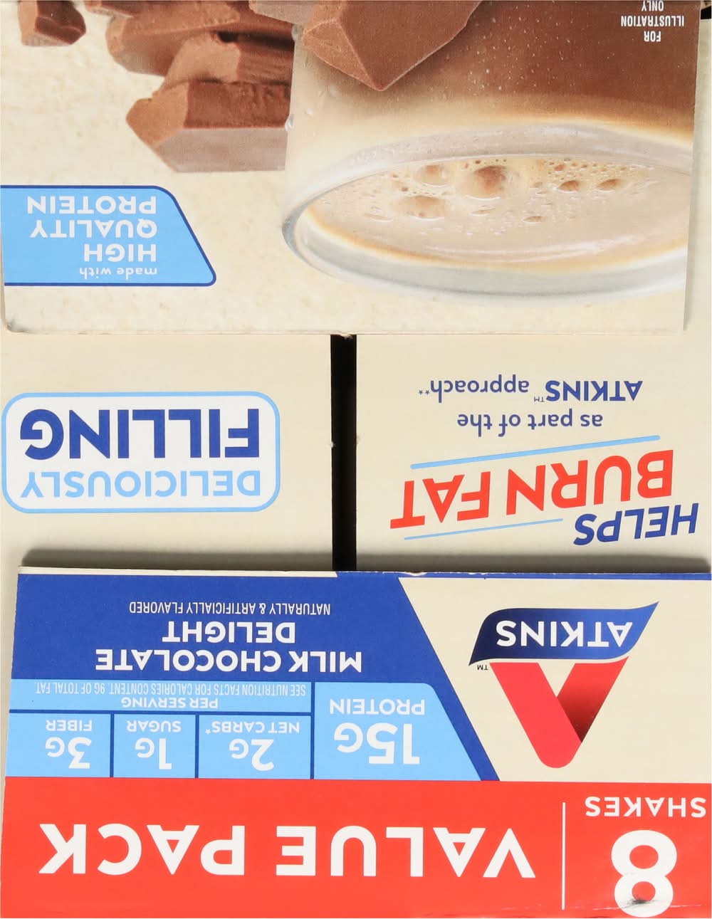 Protein-Rich Shake, Milk Chocolate Delight, Value Pack • Pack size: 8 • Atkins Nutritionals, Inc., Denver, CO, 80202 • Packaging: Reusable