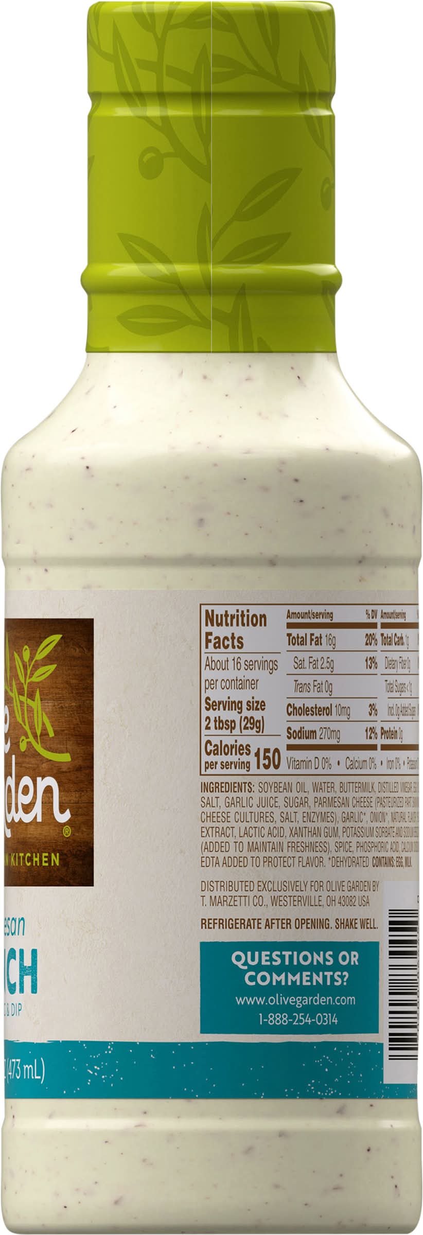 Olive Garden Parmesan Ranch Dressing 16 oz • Flavor: Parmesan ranch • T Marzetti, Westerville, OH 43802 USA • Packaging: Reusable
