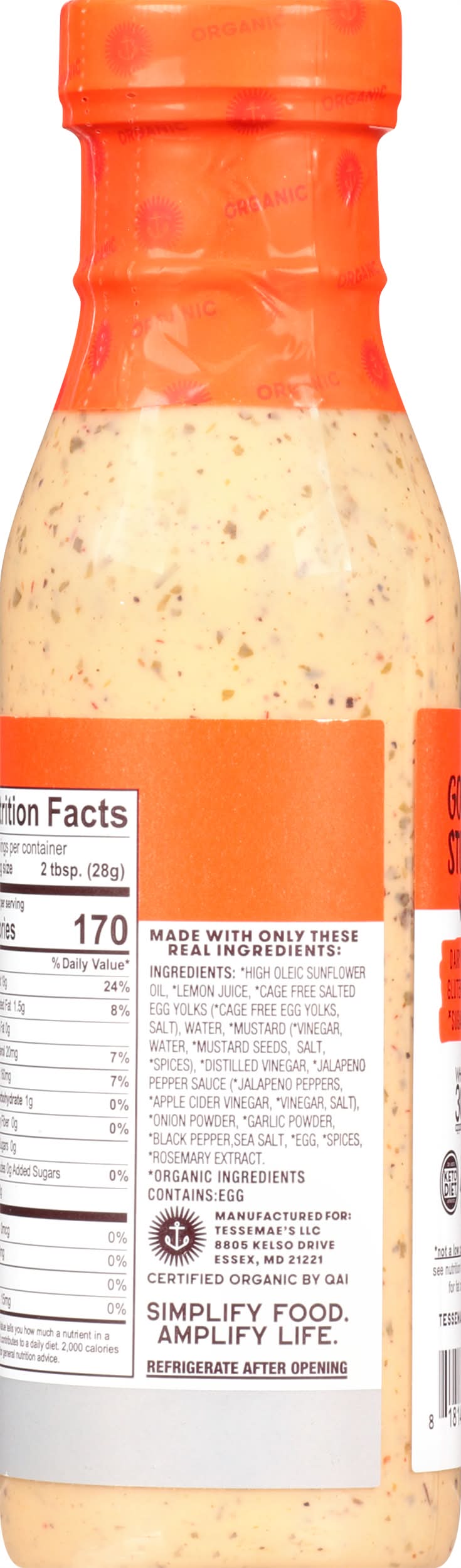 Ingredients: Made with Only These Real Ingredients: High Oleic Sunflower Oil (Organic Ingredients), Lemon Juice (Organic Ingredients), Cage Free Salted Egg Yolks (Organic Ingredients) (Cage Free Egg Yolks (Organic Ingredients), Salt), Water, Mustard (Organic Ingredients) (Vinegar (Organic Ingredients), Mustard Seeds (Organic Ingredients), Salt, Spices (Organic Ingredients)), Distilled Vinegar (Organic Ingredients), Jalapeno Pepper Sauce (Organic Ingredients) (Jalapeno Peppers (Organic Ingredients), Apple Cider Vinegar (Organic Ingredients), Vinegar (Organic Ingredients), Salt), Onion Powder (Organic Ingredients), Garlic Powder (Organic Ingredients), Black Pepper (Organic Ingredients), Sea Salt, Egg (Organic Ingredients), Spices (Organic Ingredients), Rosemary Extract (Organic Ingredients) Contains: Eggs