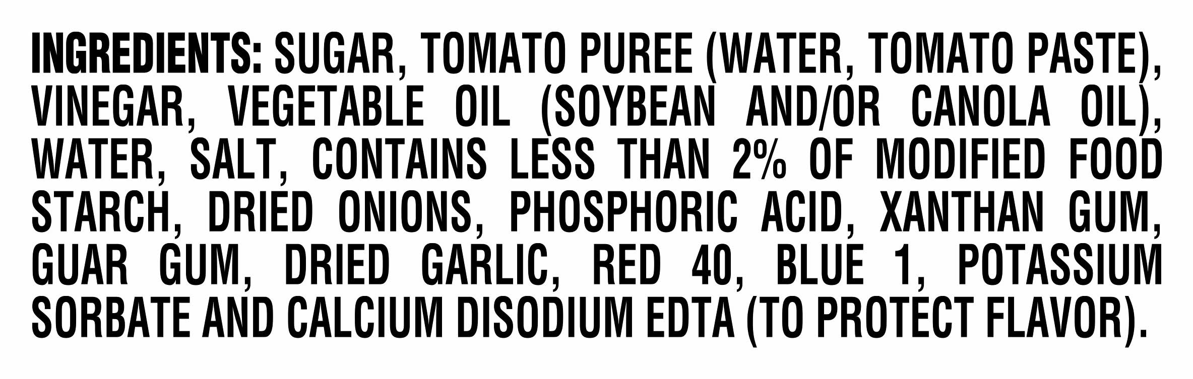 Ingredients: SUGAR, TOMATO PUREE (WATER, TOMATO PASTE), VINEGAR, VEGETABLE OIL (SOYBEAN AND/OR CANOLA OIL), WATER, SALT, CONTAINS LESS THAN 2% OF MODIFIED FOOD STARCH, DRIED ONIONS, PHOSPHORIC ACID, XANTHAN GUM, GUAR GUM, DRIED GARLIC, RED 40, BLUE 1, POTASSIUM SORBATE AND CALCIUM DISODIUM EDTA (TO PROTECT FLAVOR), .