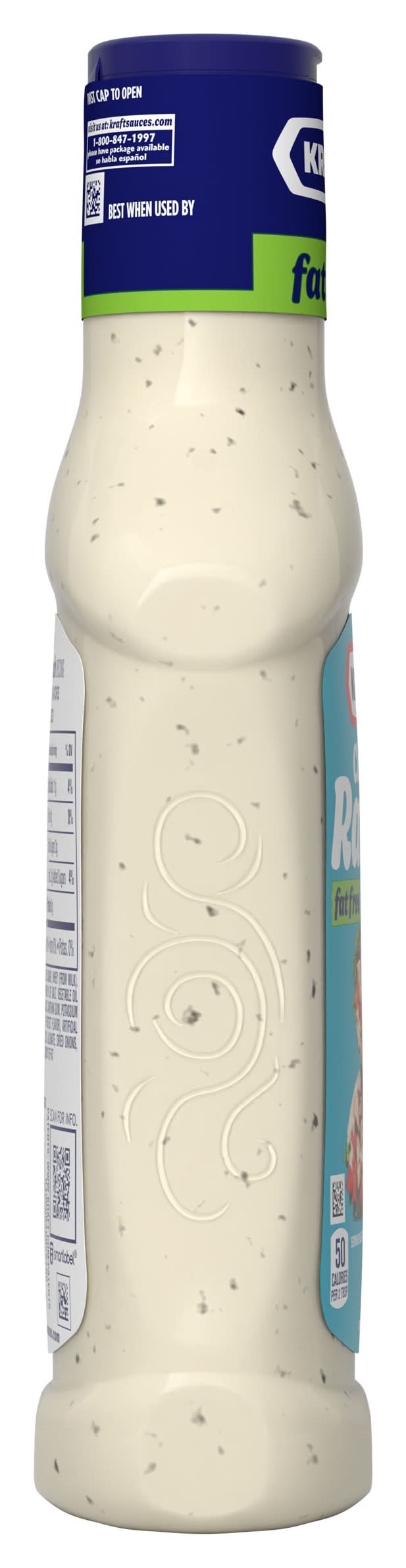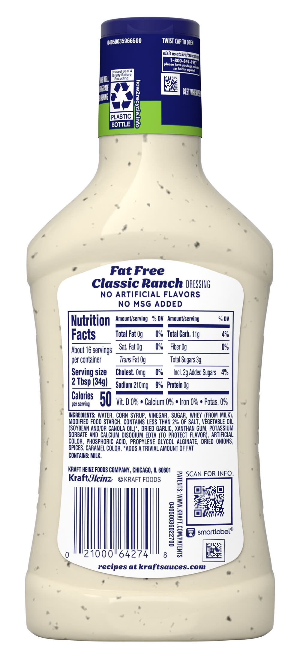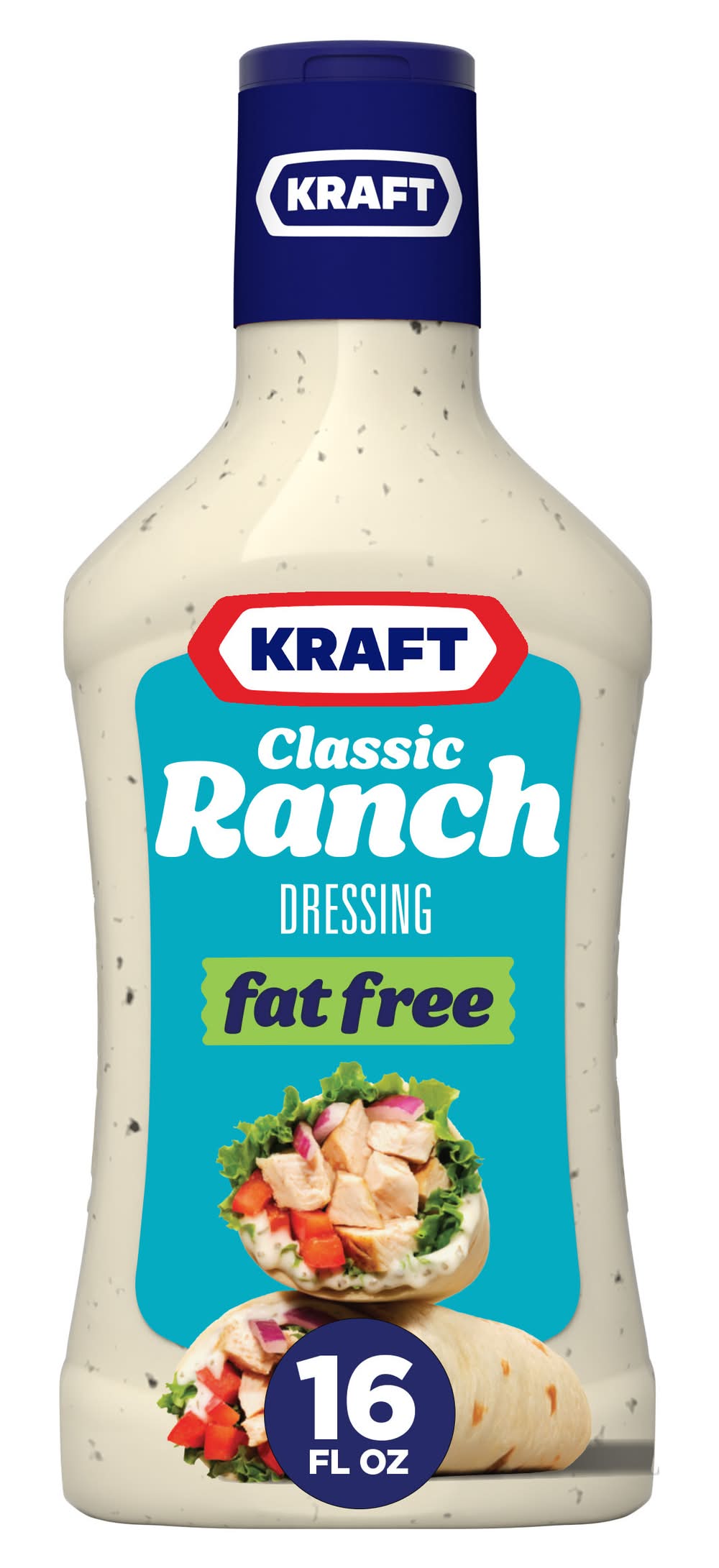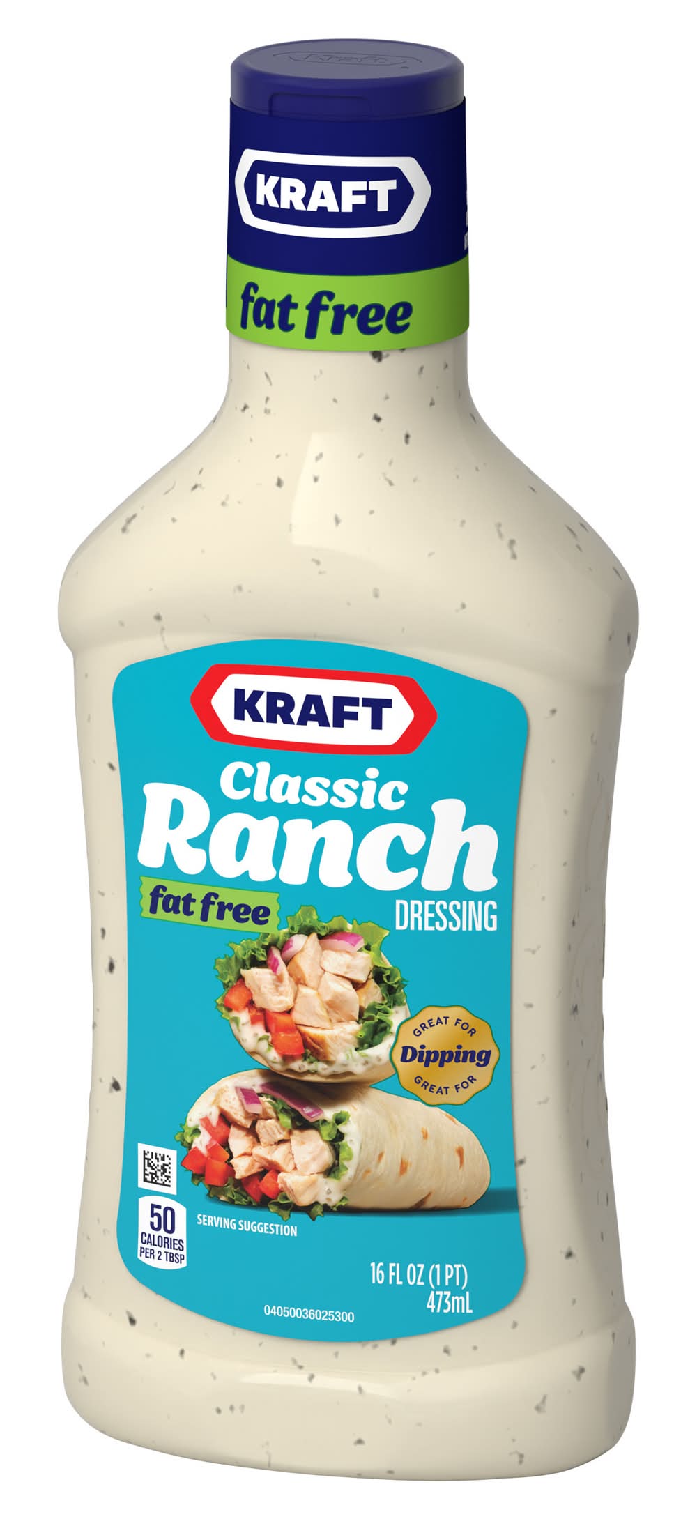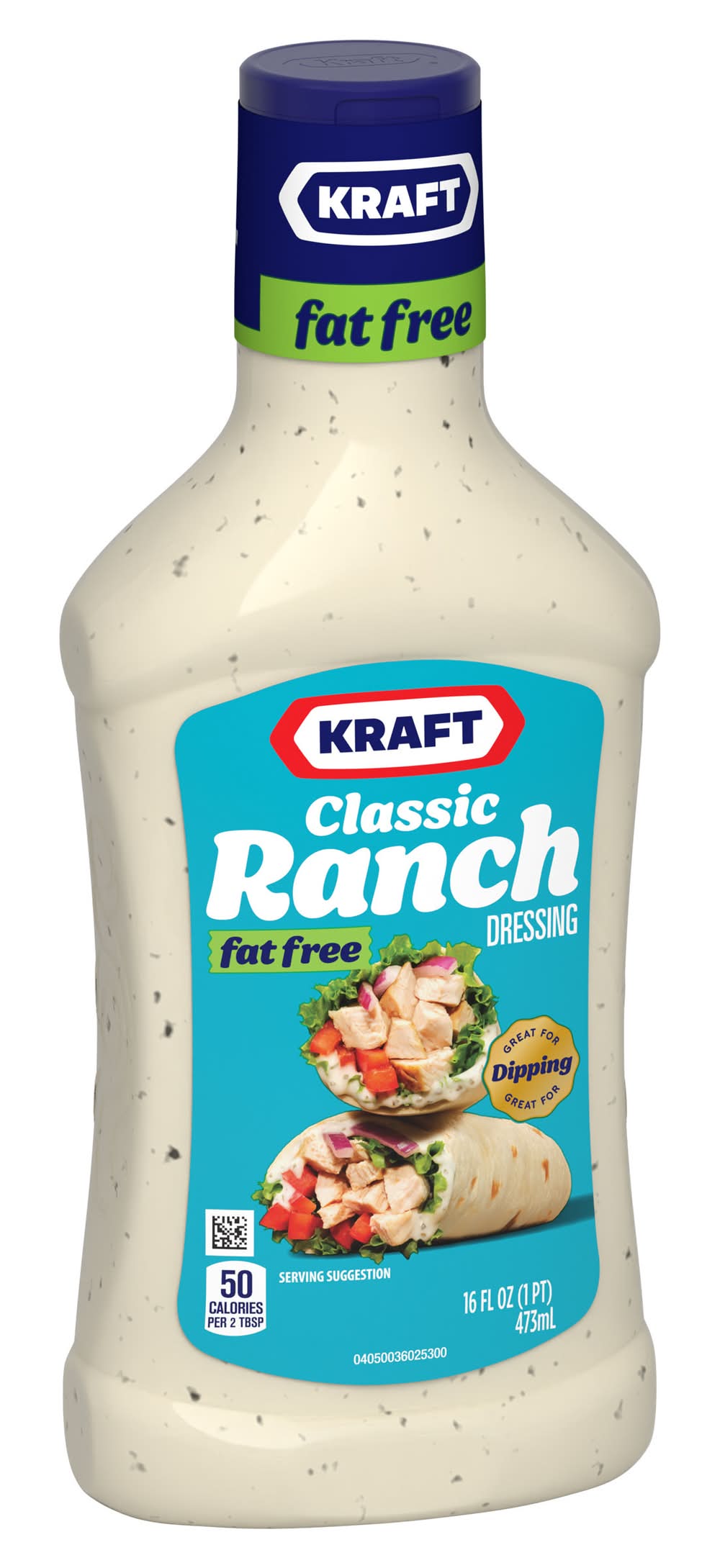 Kraft Classic Ranch Fat Free Dressing adds zesty, tangy ranch flavor to almost anything. Bursting with a delicious medley of spices, our creamy ranch dressing delivers mouthwatering flavor in every bite. Our classic dressing is thick enough for spreading or dipping, and it adds a wonderful texture to salads. Containing no fat, no artificial flavors, no added MSG and 50 calories per serving, you'll feel good about adding our ranch dressing to all your favorite appetizers and entrees. Try our restaurant style ranch dressing on salads and sandwiches or as a classic ranch dipping sauce for chicken or fresh veggies. Our fat free ranch dressing is packaged in a 16 fluid ounce squeezable bottle and comes with a convenient applicator top so you can add the perfect amount to all your favorite dishes.