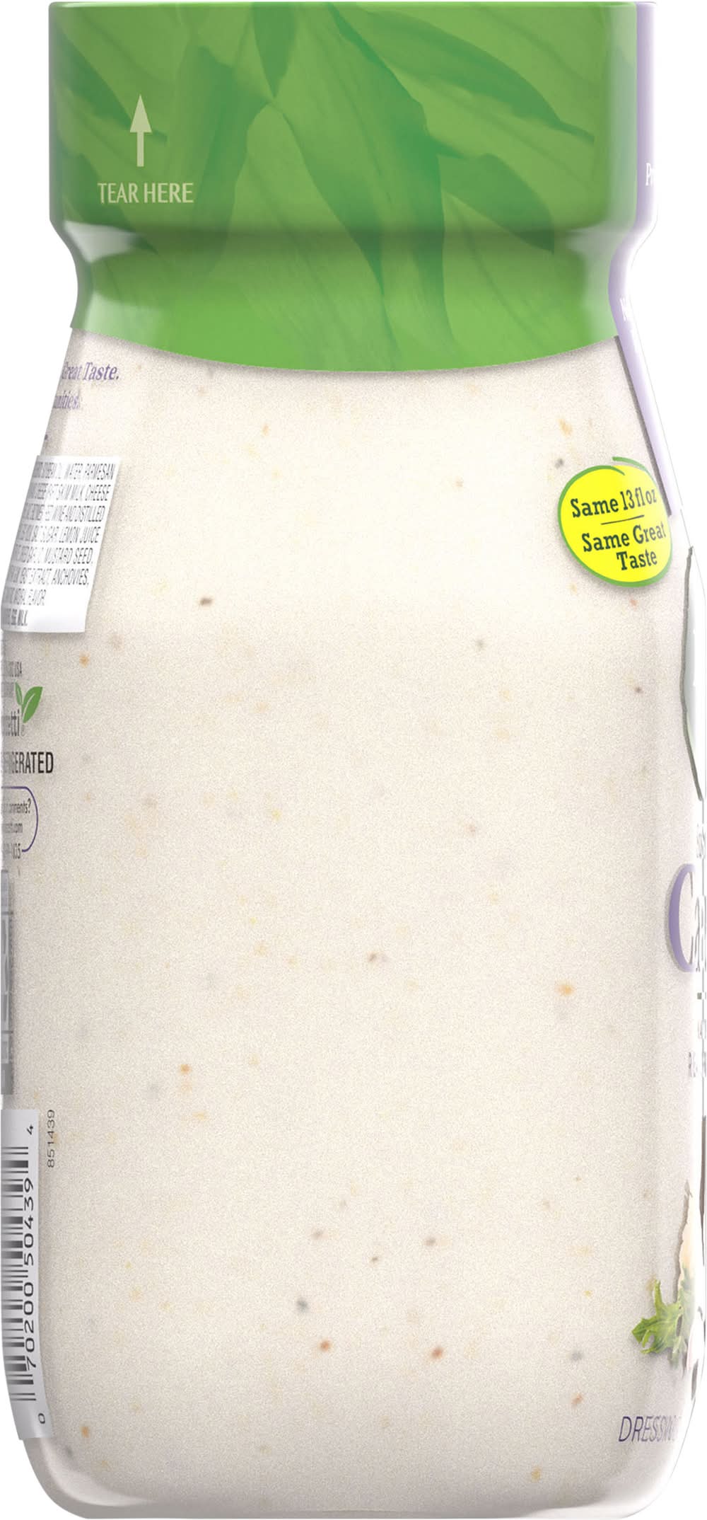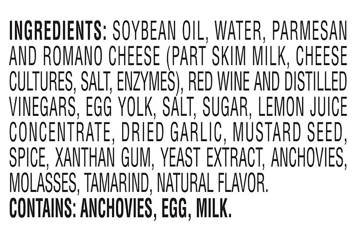 Ingredients: Soybean Oil, Water, Parmesan and Romano Cheese (Part Skim Milk, Cheese Cultures, Salt, Enzymes), Red Wine and Distilled Vinegars, Egg Yolk, Salt, Sugar, Lemon Juice Concentrate, Dried Garlic, Mustard Seed, Spice, Xanthan Gum, Yeast Extract, Anchovies, Molasses, Tamarind, Natural Flavor Contains: Fish, Anchovy, Eggs, Milk, Soybeans, Mustard