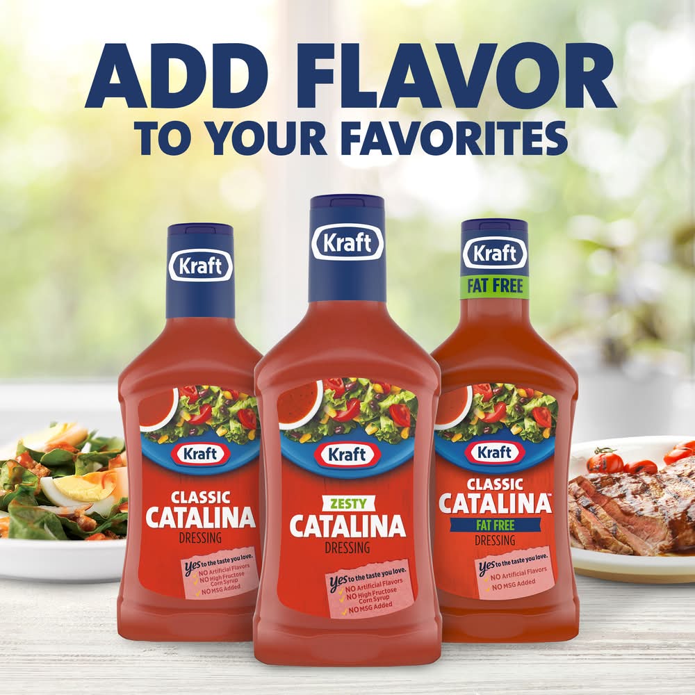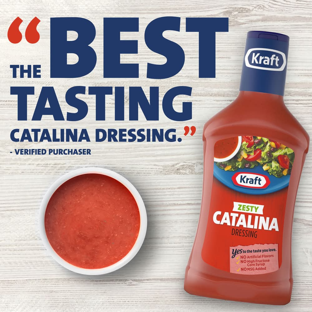 Kraft Zesty Catalina Dressing adds tangy, zesty flavor to any dish. Bursting with tomato puree, vinegar and spices, our family favorite Catalina dressing delivers mouthwatering flavor in every bite. Pre-mixed for convenience, our zesty dressing is ready to enjoy after a quick shake. Each bottle of delicious dressing is made with no artificial flavors, no high-fructose corn syrup, no added MSG and 80 calories per serving. Try Kraft Zesty Catalina Dressing on salads and sandwiches or as a dipping sauce or marinade for grilled chicken and veggies. Each 16 fluid ounce squeezable dressing bottle comes with a convenient applicator top so you can add the perfect amount to all your favorite dishes.
