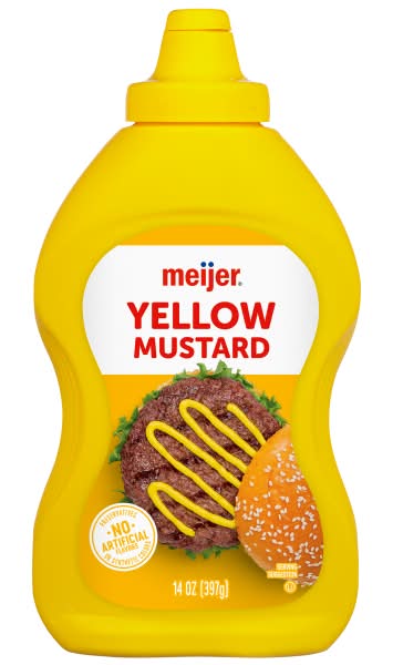 Meijer Yellow Mustard is a condiment packaged in an easy-to-squeeze bottle. It is suitable for enhancing the flavors of hot dogs, burgers, and pasta salads. Additionally, it can be utilized in the preparation of various sauces. This product is ideal for use at cookouts and picnics.
