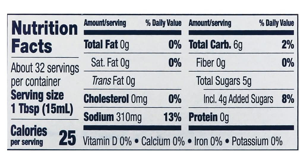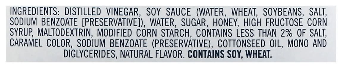 Ingredients: Distilled Vinegar, Soy Sauce (Water, Wheat, Soybeans, Salt, Sodium Benzoate [Preservative]), Water, Sugar, Honey, High Fructose Corn Syrup, Maltodextrin, Modified Corn Starch, Contains Less than 2% of Salt, Caramel Color, Sodium Benzoate (Preservative), Cottonseed Oil, Mono and Diglycerides, Natural Flavor Contains: Soybeans, Wheat