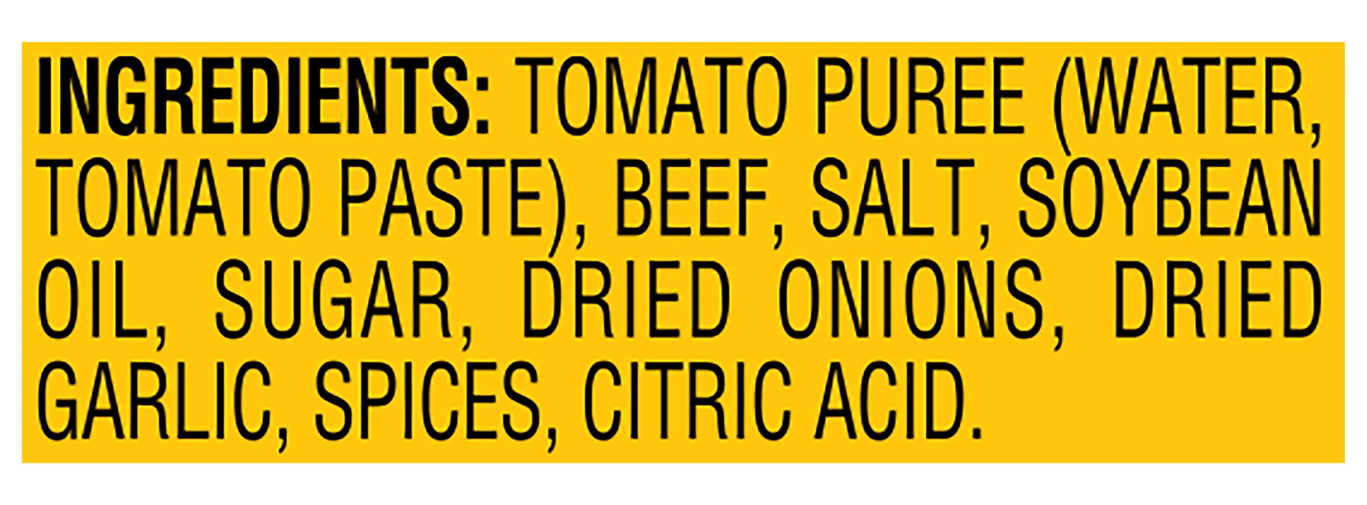 Ingredients: Tomato Puree (Water, Tomato Paste), Beef, Salt, Soybean Oil, Sugar, Dried Onions, Dried Garlic, Spices, Citric Acid