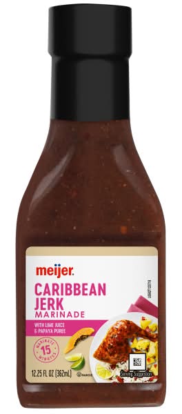 Meijer Marinade Caribbean Jerk is crafted with lime juice and papaya puree, offering a versatile option for enhancing the flavor of fish, poultry, or grilled vegetables. This marinade is suitable for a variety of cooking methods such as grilling, oven baking, and slow cooking. Users can adjust the marinating time to suit their taste preferences.