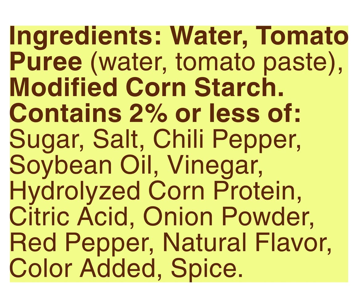 Ingredients: Water, Tomato Puree (Water, Tomato Paste), Modified Corn Starch, Contains 2% or Less of: Sugar, Salt, Chili Pepper, Soybean Oil, Vinegar, Hydrolyzed Corn Protein, Citric Acid, Onion Powder, Red Pepper, Natural Flavor, Color Added, Spice. Contains: Corn, Soybeans