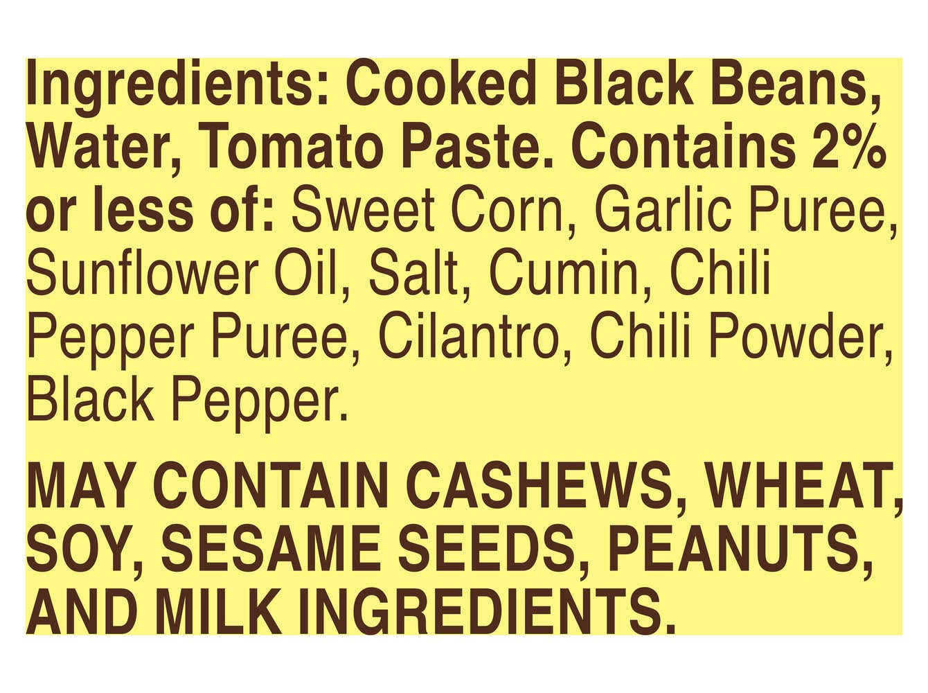 Ingredients: Cooked Black Beans, Water, Tomato Paste. Contains 2% or Less of: Sweet Corn, Garlic Puree, Sunflower Oil, Salt, Cumin, Chili Pepper Puree, Cilantro, Chili Powder, Black Pepper Contains: Tree Nuts, Cashews, Wheat, Soybeans, Sesame, Peanuts, Milk