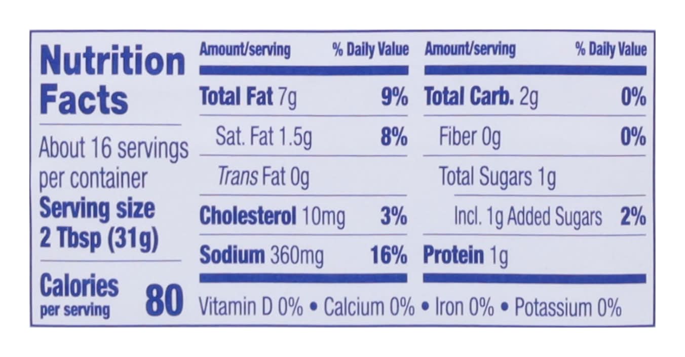 Ingredients: Water, Vegetable Oil (Soybean and/or Canola), Distilled Vinegar, Blue Cheese ([Cultured Pasteurized Milk, Salt, Enzymes, Penicillium Roqueforti], Natamycin [Natural Mold Inhibitor]), Salt, Maltodextrin, Sugar, Contains Less than 2% of Egg Yolk, Cellulose Gel and Gum, Natural Flavor, Palm Oil, Phosphoric Acid, Whey Protein Concentrate, Propylene Glycol Alginate, Xanthan Gum, Lemon Juice Concentrate, Sodium and Calcium Caseinates, Garlic, Citric Acid, Potassium Sorbate (Preservative), Titanium Dioxide (Color), Onion, Yeast Extract, Spice, Rosemary Extract and Green Tea Extract, Lactic Acid, Calcium Disodium EDTA (to Protect Flavor), Locust Bean Gum. * Dried Contains: Milk, Eggs, Soybeans
