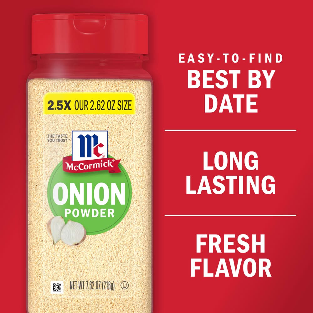 McCormick Onion Powder is always made from onions. So convenient, it makes it easy to add savory richness to just about any dish—from soups and sauces to vegetables, chicken, and hamburgers. Onion is an important flavoring in almost every cuisine. With McCormick Onion Powder, we make it easy and convenient to add delicious onion flavor to all your dishes. Add to rubs and seasoning blends to sprinkle on grilled or roasted meats or vegetables. Powdered onion disperses completely and evenly into your dishes, making it perfect for soups, sauces, dips and dressings. Meal preparation becomes a snap when no peeling or cutting of onions is needed. Try 1 tbsp. Onion powder in place of 1/2 cup chopped fresh onions. McCormick, Hunt Valley,MD,21031-1105