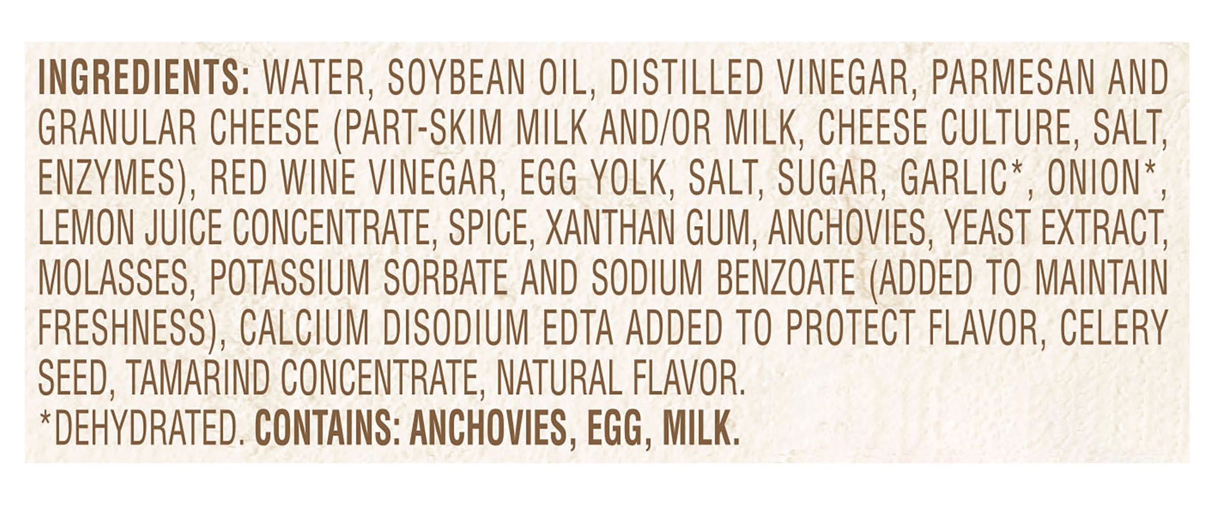 Ingredients: Water, Soybean Oil, Distilled Vinegar, Parmesan and Granular Cheese (Part-Skim Milk and/or Milk, Cheese Culture, Salt, Enzymes), Red Wine Vinegar, Egg Yolk, Salt, Sugar, Garlic*, Onion*, Lemon Juice Concentrate, Spice, Xanthan Gum, Anchovies, Yeast Extract, Molasses, Potassium Sorbate and Sodium Benzoate (Added to Maintain Freshness), Calcium Disodium EDTA Added to Protect Flavor, Celery Seed, Tamarind Concentrate, Natural Flavor, * Dehydrated Contains: Fish, Anchovy, Eggs, Milk, Celery, Soybeans