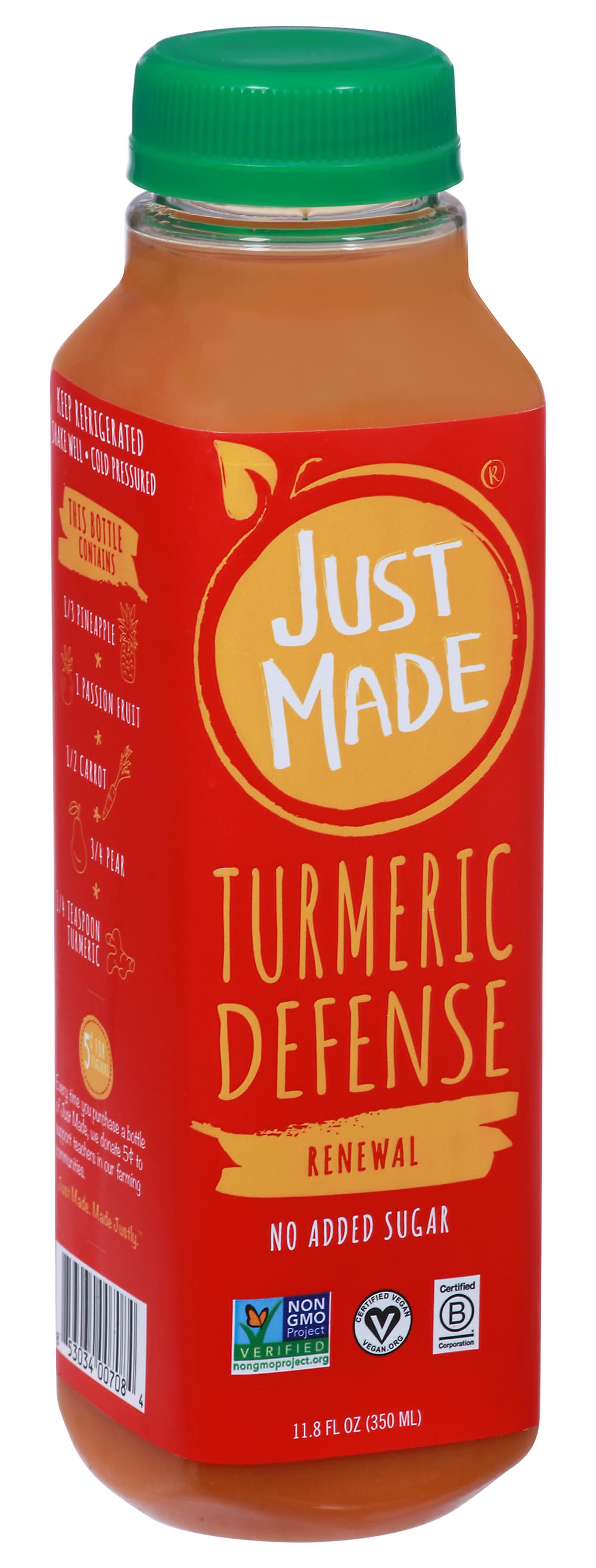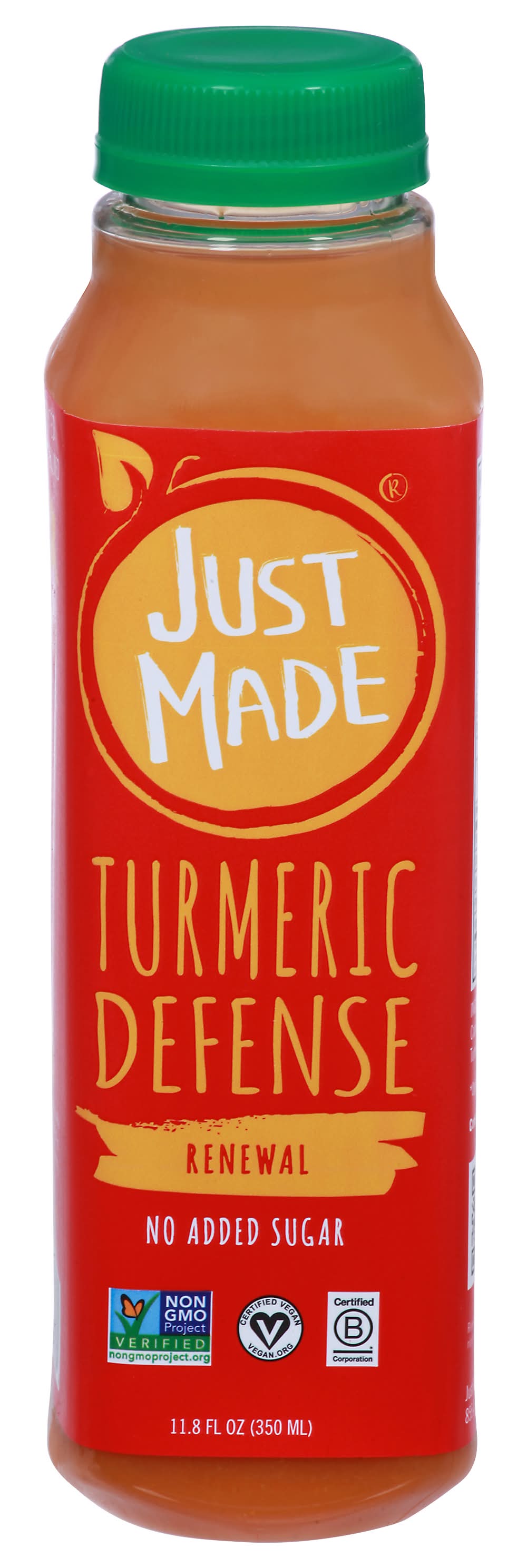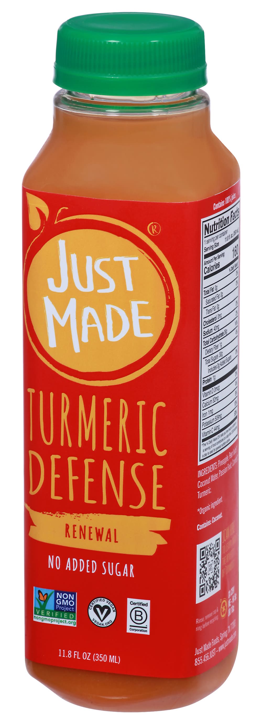 Fruit & Vegetable Drinks, Turmeric Defense, Renewal • Number of servings: 1 • Just Made Foods, Spring, TX, 77393, Ph: 855-456-JUST • Packaging: Reusable