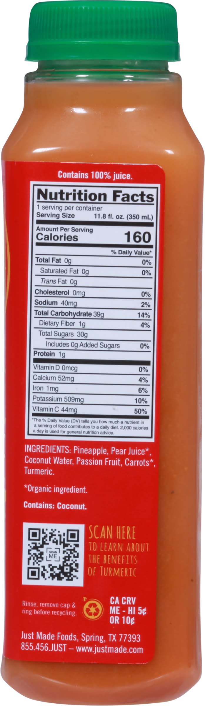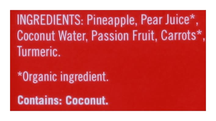 Ingredients: Pineapple, Pear Juice (Organic Ingredient), Coconut Water, Passion Fruit, Carrots (Organic Ingredient), Turmeric Contains: Tree Nuts, Coconuts