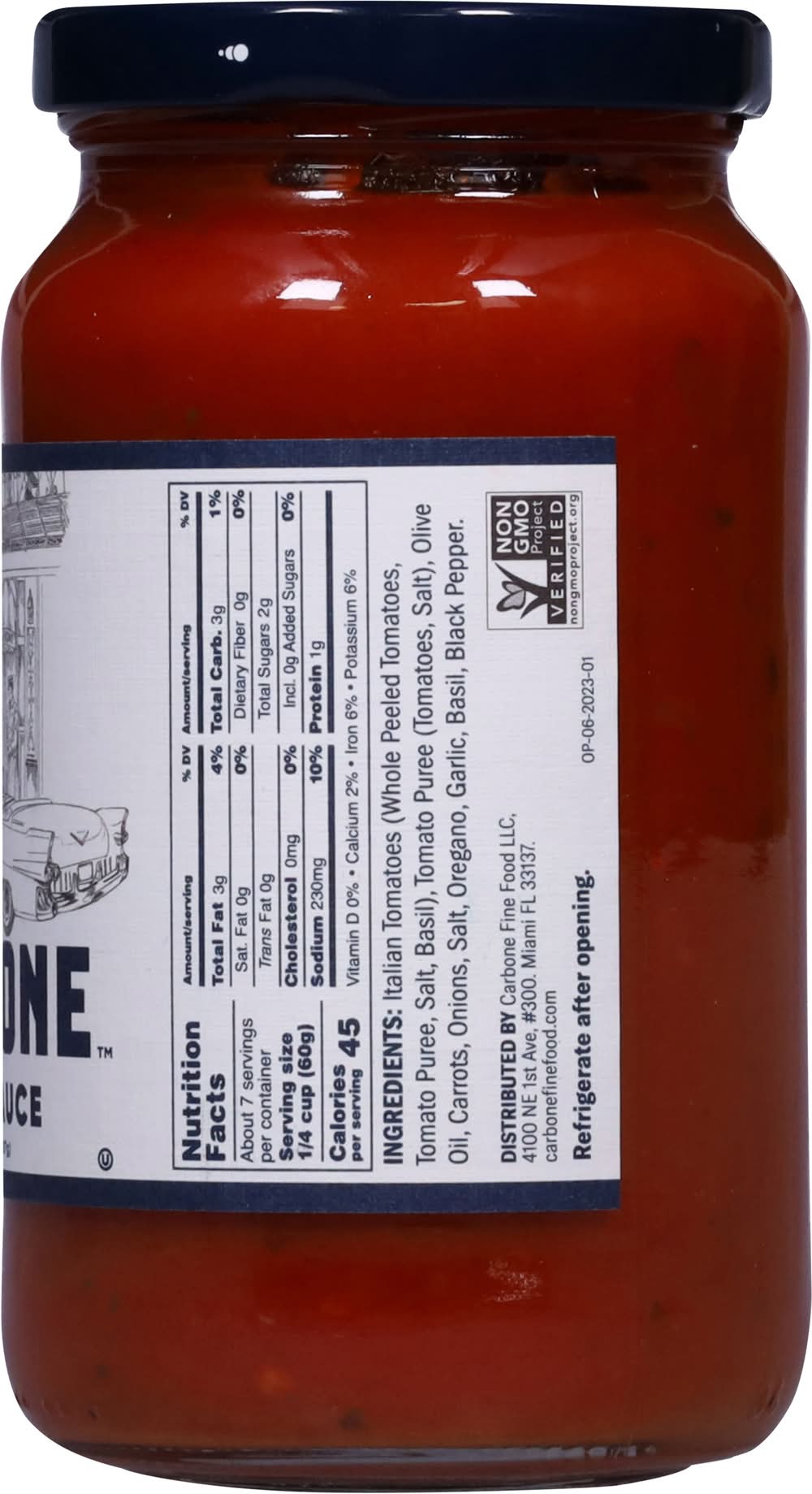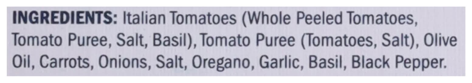Ingredients: Italian Tomatoes (Whole Peeled Tomatoes, Tomato Puree, Salt, Basil), Tomato Puree (Tomatoes, Salt), Olive Oil, Carrots, Onions, Salt, Oregano, Garlic, Basil, Black Pepper