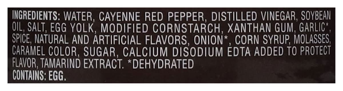 Ingredients: Water, Cayenne Red Pepper, Distilled Vinegar, Soybean Oil, Salt, Egg Yolk, Modified Cornstarch, Xanthan Gum, Garlic*, Spice, Natural and Artificial Flavors, Onion*, Corn Syrup, Molasses, Caramel Color, Sugar, Calcium Disodium EDTA Added to Protect Flavor, Tamarind Extract. * Dehydrated Contains: Soybeans, Eggs