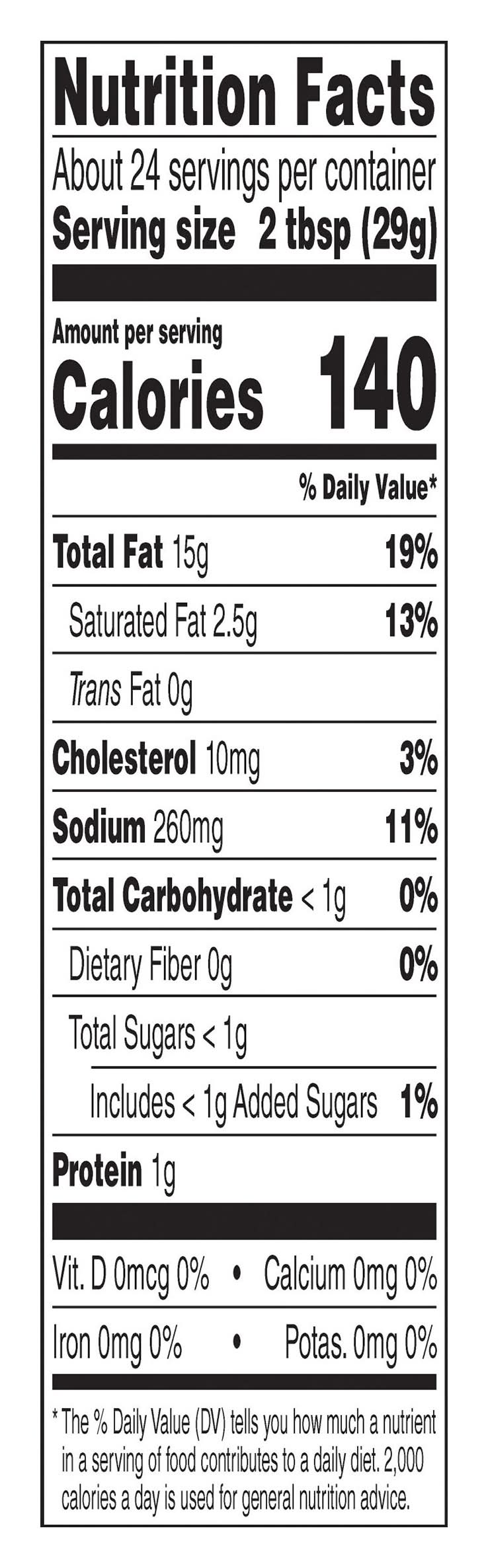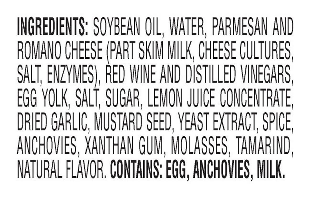 Ingredients: Soybean Oil, Water, Parmesan and Romano Cheese (Part Skim Milk, Cheese Cultures, Salt, Enzymes), Red Wine and Distilled Vinegars, Egg Yolk, Salt, Sugar, Lemon Juice Concentrate, Dried Garlic, Mustard Seed, Yeast Extract, Spice, Anchovies, Xanthan Gum, Molasses, Tamarind Natural Flavor Contains: Eggs, Fish, Anchovy, Milk, Soybeans, Mustard