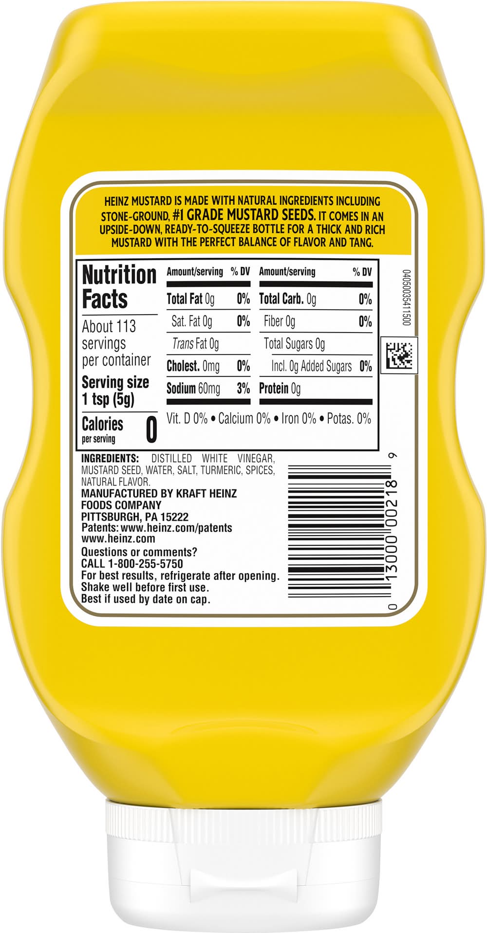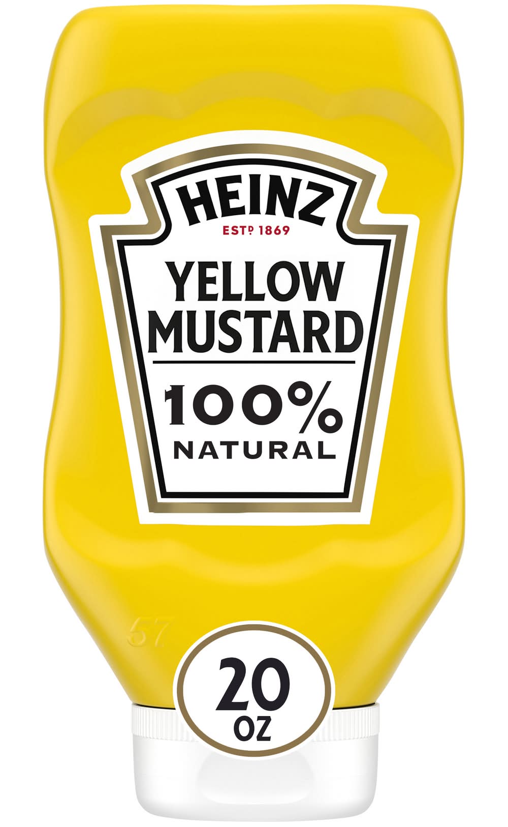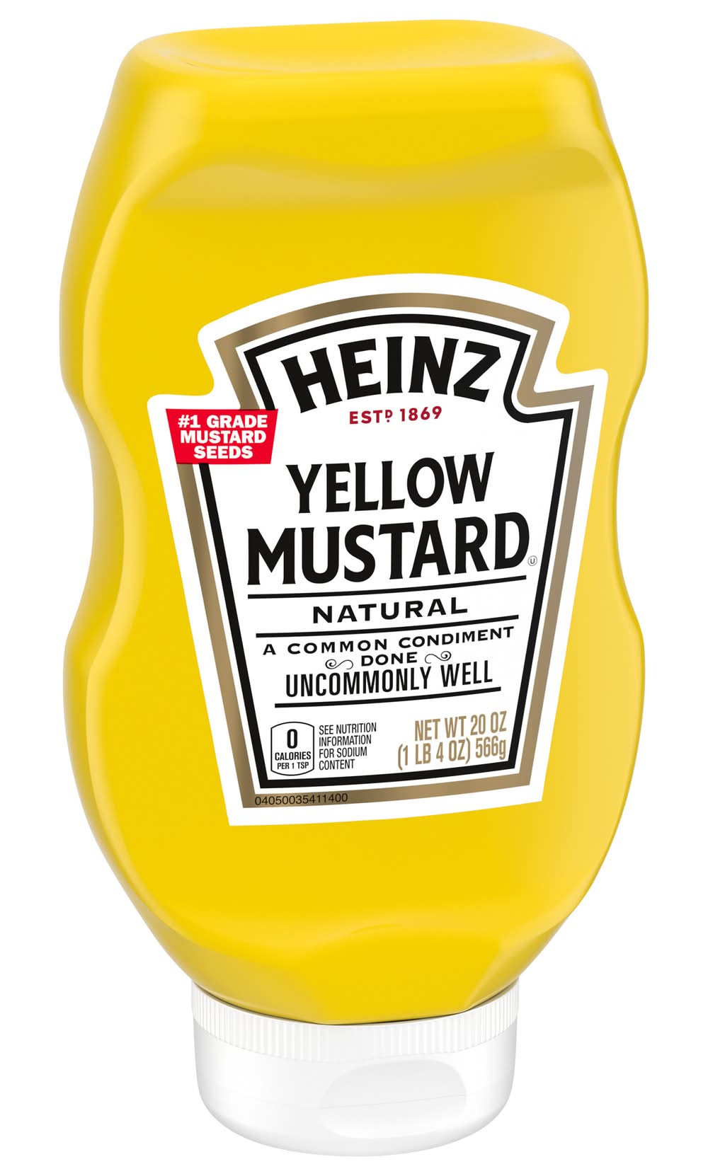 Heinz Yellow Mustard offers the trusted, flavorful taste that complements a wide range of foods. Try our yellow mustard on a burger, hot dog or sub sandwich. Made with #1 grade mustard seeds, our mustard delivers the classic mustard taste you know and love. Our deliciously prepared yellow mustard will elevate any meal and will surely be a hit with the entire family. The 20 ounce upside-down squeeze bottle makes it easy to use without the watery mess. Whatever the occasion, Heinz Yellow Mustard delivers the rich and tangy flavor your whole family will love.