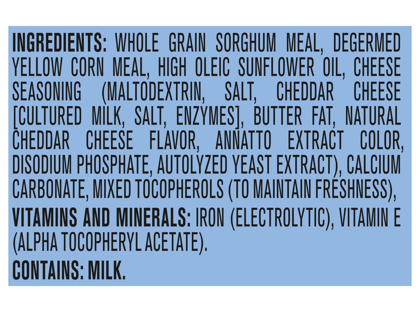 Ingredients: Whole Grain Sorghum Meal, Degermed Yellow Corn Meal, High Oleic Sunflower Oil, Cheese Seasoning (Maltodextrin, Salt, Cheddar Cheese Maltodex [Cultured Milk, Salt, Enzymes], Butter Fat, Natural Cheddar Cheese Flavor, Annatto Extract Color, Disodium Phosphate, Autolyzed Yeast Extract), Calcium Carbonate, Mixed Tocopherols (to Maintain Freshness), Vitamins and Minerals: Iron (Electrolytic), Vitamin E (Alpha Tocopheryl Acetate) Contains: Milk
