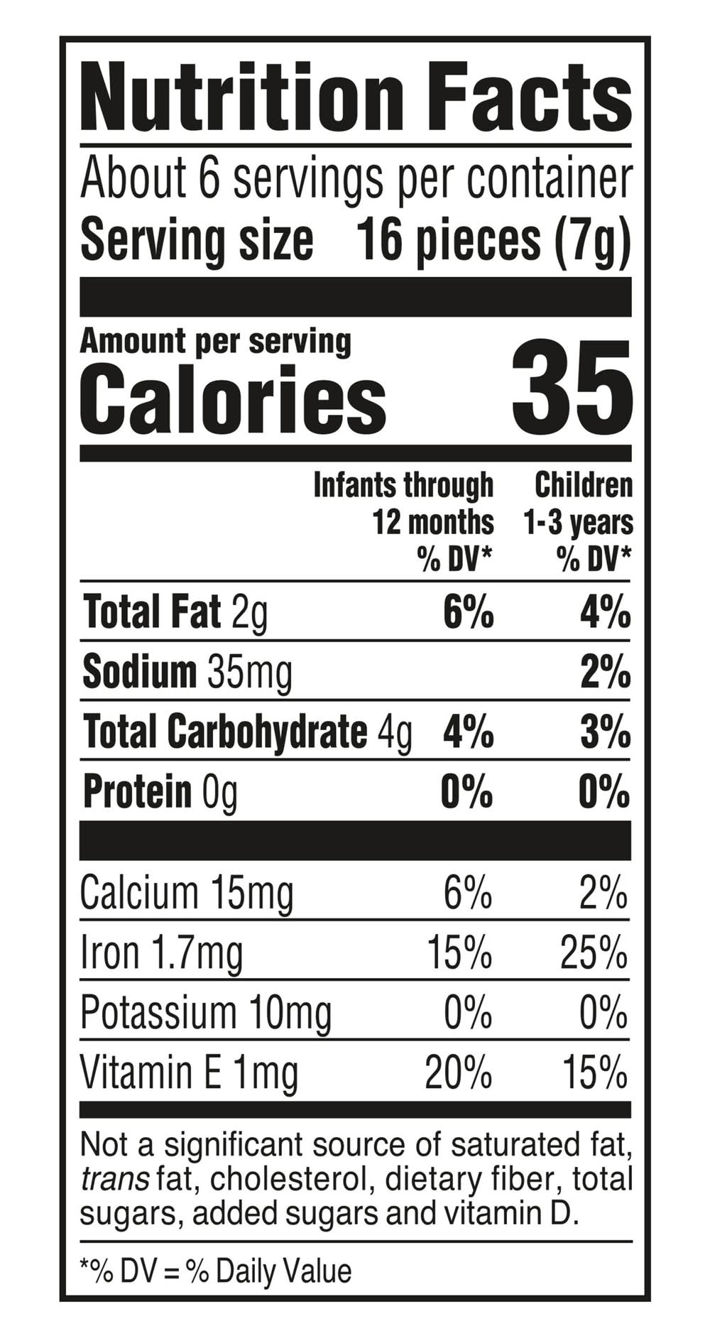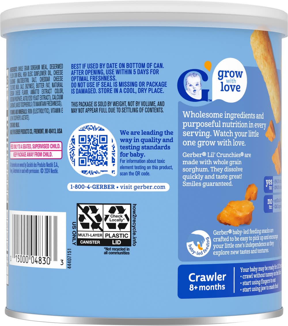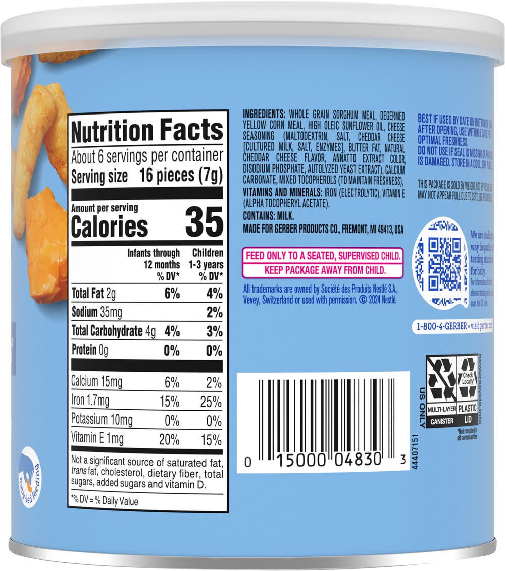 These Cheddar Snacks are designed for babies who are at the crawler stage, typically around 8 months or older. These snacks are naturally flavored and contain no artificial flavors. Each serving includes 2 grams of whole grains, with ingredients that are not genetically modified. The snacks are crafted with whole grain sorghum to be easily dissolved, offering a pleasing taste. They are shaped in perfectly sized pieces to encourage babies to develop their pincer grasp for self-feeding. While the package is sold by weight, settling of contents can cause the appearance of it being not full. • Gerber Products Company, Fremont, MI, 49413, USA • Packaging: Reusable