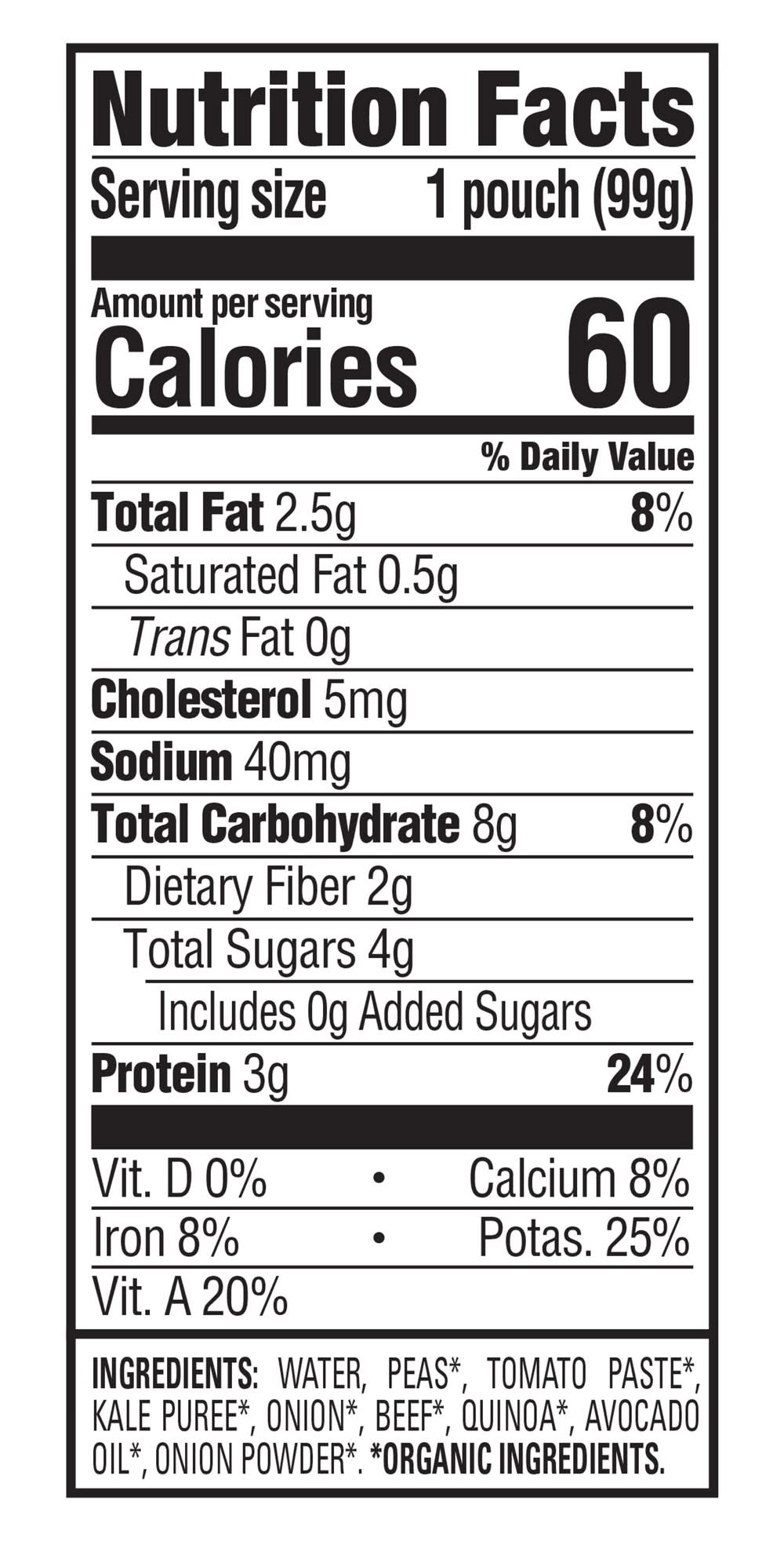 Ingredients: WATER, PEAS*, TOMATO PASTE*, KALE PUREE*, ONION*, BEEF*, QUINOA*, AVOCADO OIL*, ONION POWDER*. ORGANIC INGREDIENTS.