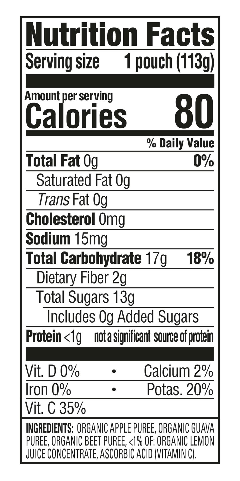 Ingredients: ORGANIC APPLE PUREE, ORGANIC GUAVA PUREE, ORGANIC BEET PUREE, 1% OF: ORGANIC LEMON JUICE CONCENTRATE, ASCORBIC ACID (VITAMIN C), .