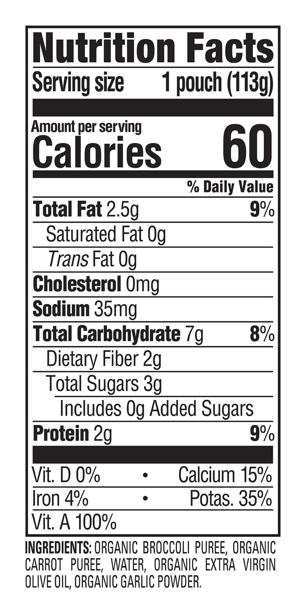 Ingredients: ORGANIC BROCCOLI PUREE, ORGANIC CARROT PUREE, WATER, ORGANIC EXTRA VIRGIN OLIVE OIL, ORGANIC GARLIC POWDER.