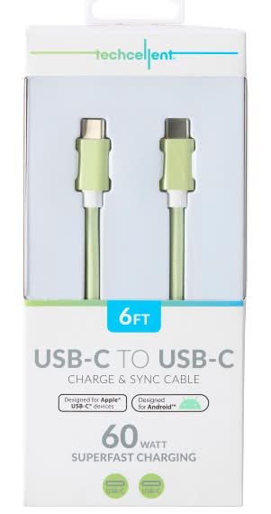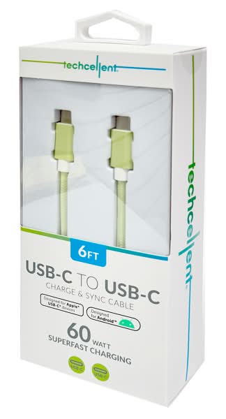 Techcellent 6ft Type C to Type C charge and sync cable, compatible with most Type C devices. Ensure a maximum charging speed up to 3A, charge faster than more standard cables, and work better for tablets and quick charge devices. Great performance ensures your devices sync and charge simultaneously with up to 490Mb/s USB3.0 version transferring speed of 5V/3A. • Color: Mint • Size: 6 ft • Packaging: Reusable
