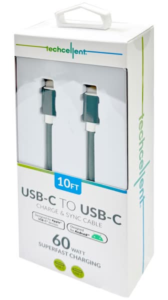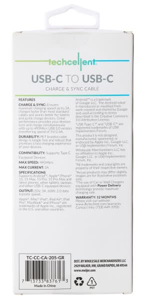 Techcellent 10ft Type C to Type C charge and sync cable, compatible with most Type C devices. Ensure a maximum charging speed up to 3A, charge faster than more standard cables, and work better for tablets and quick charge devices. Great performance ensures your devices sync and charge simultaneously with up to 490Mb/s USB3.0 version transferring speed of 5V/3A. • Color: Hunter green • Size: 10 Ft • Wholesale Merchandisers Llc., 2929 Walker, Nw, Grand Rapids, Mi 49544 • Packaging: Reusable