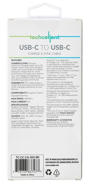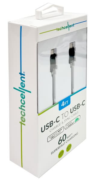 Techcellent 4ft Type C to Type C charge and sync cable, compatible with most Type C devices. Ensure a maximum charging speed up to 3A, charge faster than more standard cables, and work better for tablets and quick charge devices. Great performance ensures your devices sync and charge simultaneously with up to 490Mb/s USB3.0 version transferring speed of 5V/3A. • Color: Black • Size: 4 ft. • Packaging: Reusable