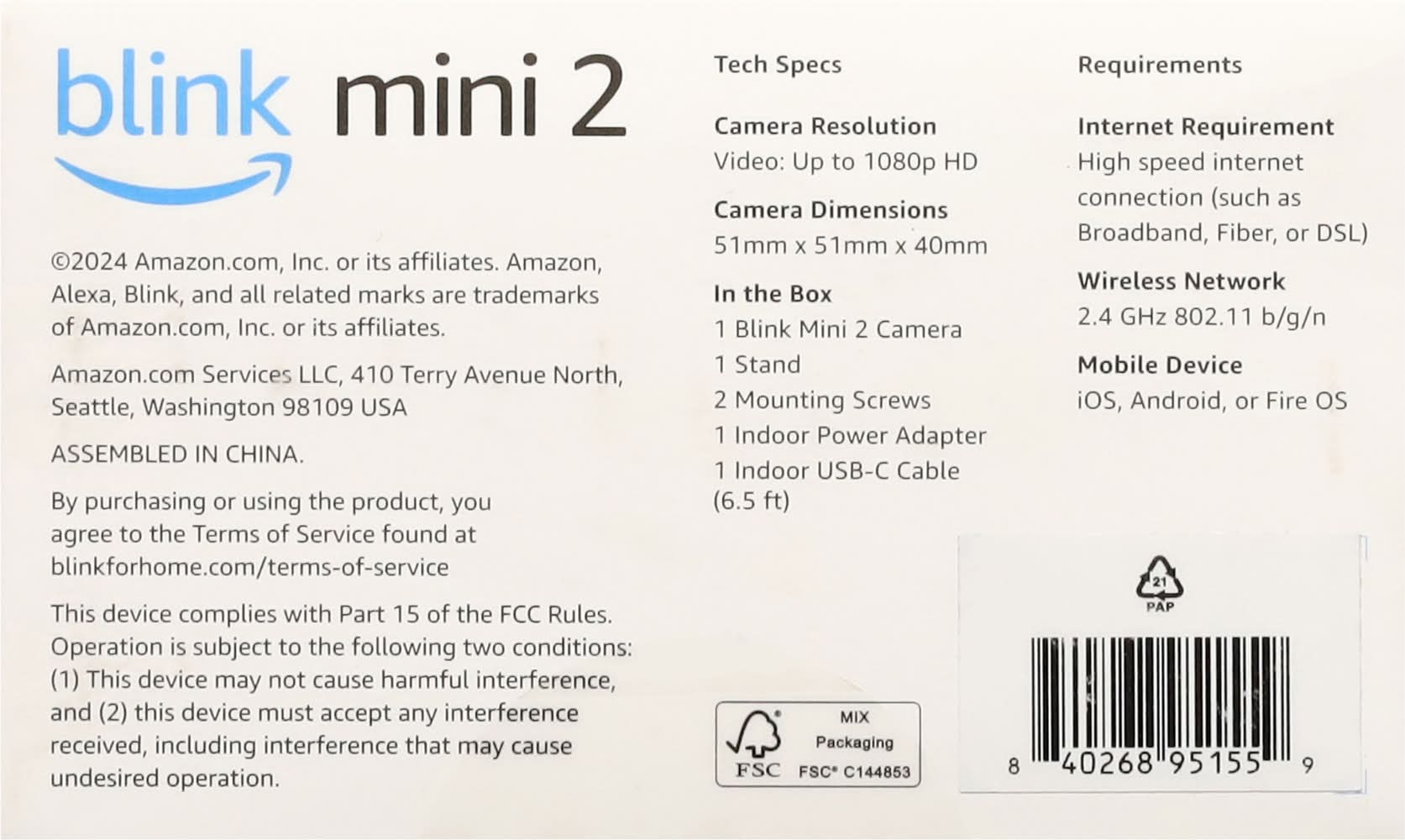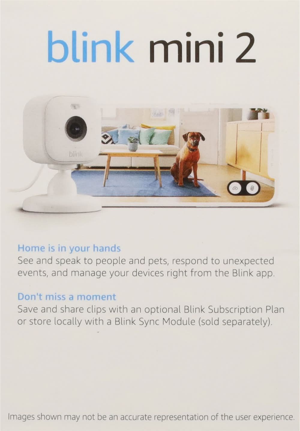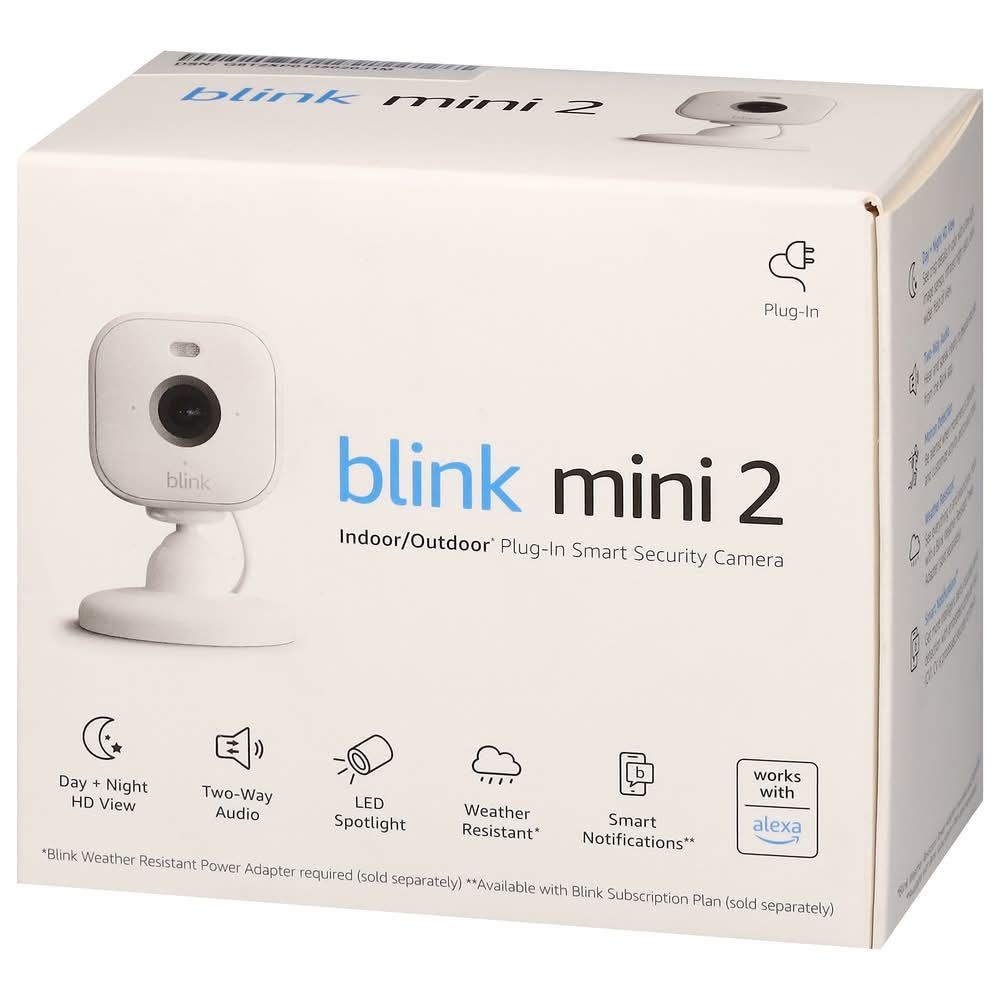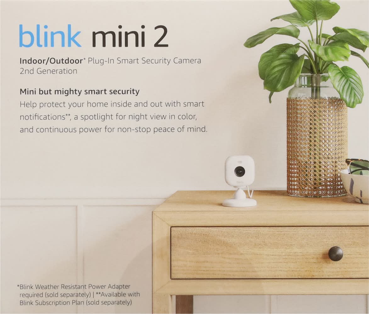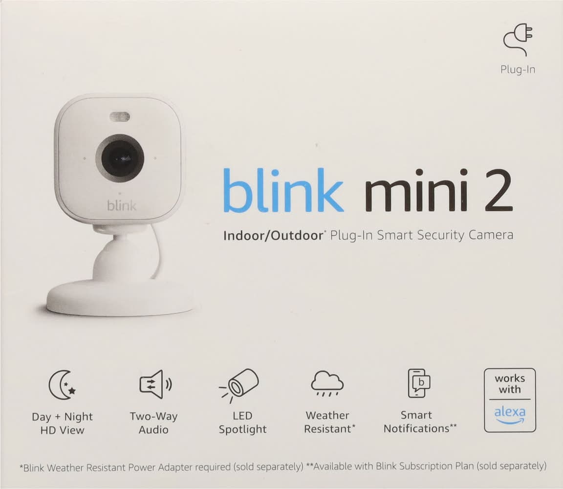 In the Box: 1 blink mini 2 camera; 2 stand; 2 mounting screws; 1 indoor power adaptor; 1 indoor USB-C cable (6.5 ft). Plug-in. Indoor/outdoor (Blink weather resistant power adapter required (sold separately)) plug-in smart security camera. Day + night HD view. Two-way audio. LED spotlight. Weather resistant (Blink weather resistant power adapter required (sold separately)). Smart notification (Available with Blink Subscription Plan (sold separately)). Works with Alexa. Home is in your hands. See and speak to people and pets, respond to unexpected events, and manage your devices right from the Blink app. Don't miss a moment. Save and share clips with an optional Blink Subscription Plan or store locally with a Blink Sync Module (sold separately). Images shown may not be an accurate representation of the user experience. Mini but mighty smart security. Help protect your home inside and out with smart notifications (Available with Blink Subscription Plant (sold separately)), a spotlight for night view in color, and continuous power for non-stop peace of mind. Day+Night HD view: see crisp details in color with a low-light image sensor, infrared night vision, and a wider field of view. Two-way audio: Hear and speak clearly to people and pets from the Blink app. Motion detection: Be alerted when movement is detected, and customize activity and privacy zones. Weather resistant (blink weather resistant power adapter requirement (sold separately)): See everything in and around your home with a blink weather resistant power adapter (sold separately). Smart notifications (available with blink subscription plant (sold separately)): Get more intelligent alerts including person detection with embedded computer vision (CV). CV is processed securely on device. Tech Specs: Camera Resolution: Video: Up to 1080p HD. Camera Dimensions: 51mm x 51mm x 40mm. Requirements: Internet Requirement: High speed internet connection (such as Broadband, Fiber, or DSL). Wireless Network: 2.4 GHz 802.11 b/g/n. Mobile Device: iOS, Android, or Fire OS. FSC: Mix - Packaging. • Color: White • Packaging: Reusable