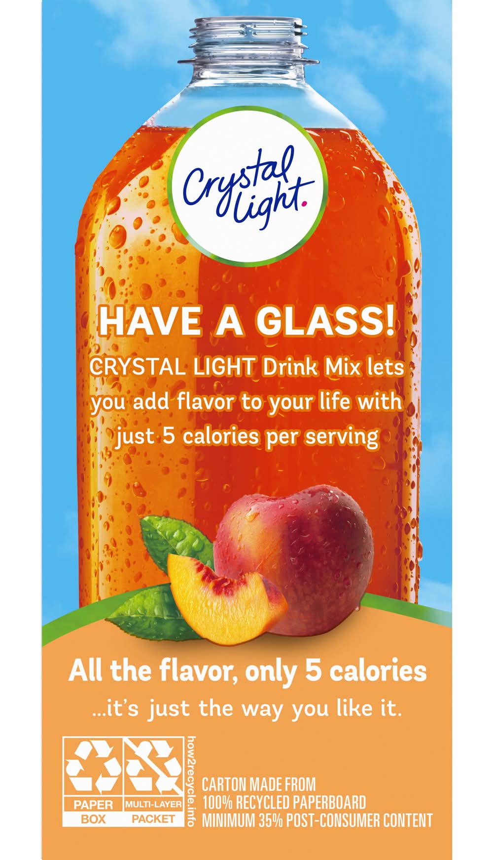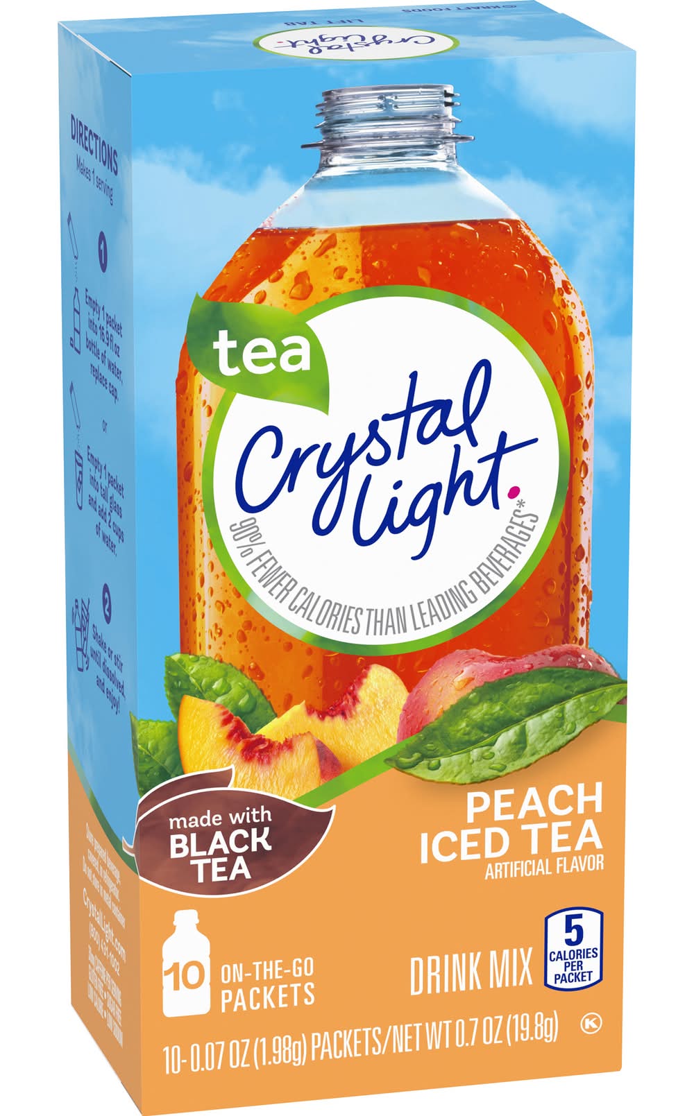 Crystal Light On-The-Go Sugar Free Peach Tea Powdered Drink Mix is a light and refreshing beverage you can enjoy at any time of day. Its also made with real black tea for a refreshingly smooth taste. This 0.07 ounce individual packet fits easily in your bag, desk, or car, so you can enjoy a refreshing glass of Crystal Light anywhere. Simply empty one drink mix packet into a bottle of water or a glass with 2 1/2 cups of water, shake or stir, and enjoy! All the flavor and only 5 calories per packet. just the way you like it. • Flavor: Peach iced tea • Pack size: 10 • Packaging: Reusable