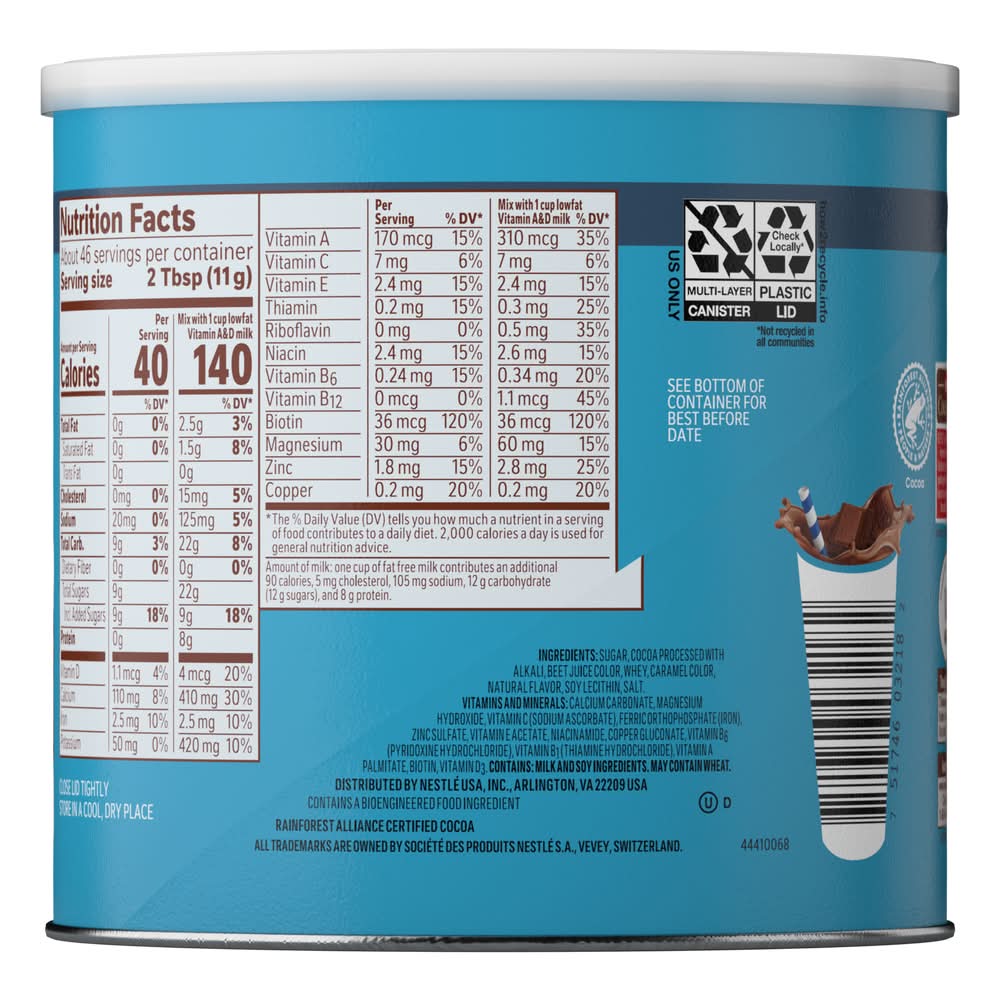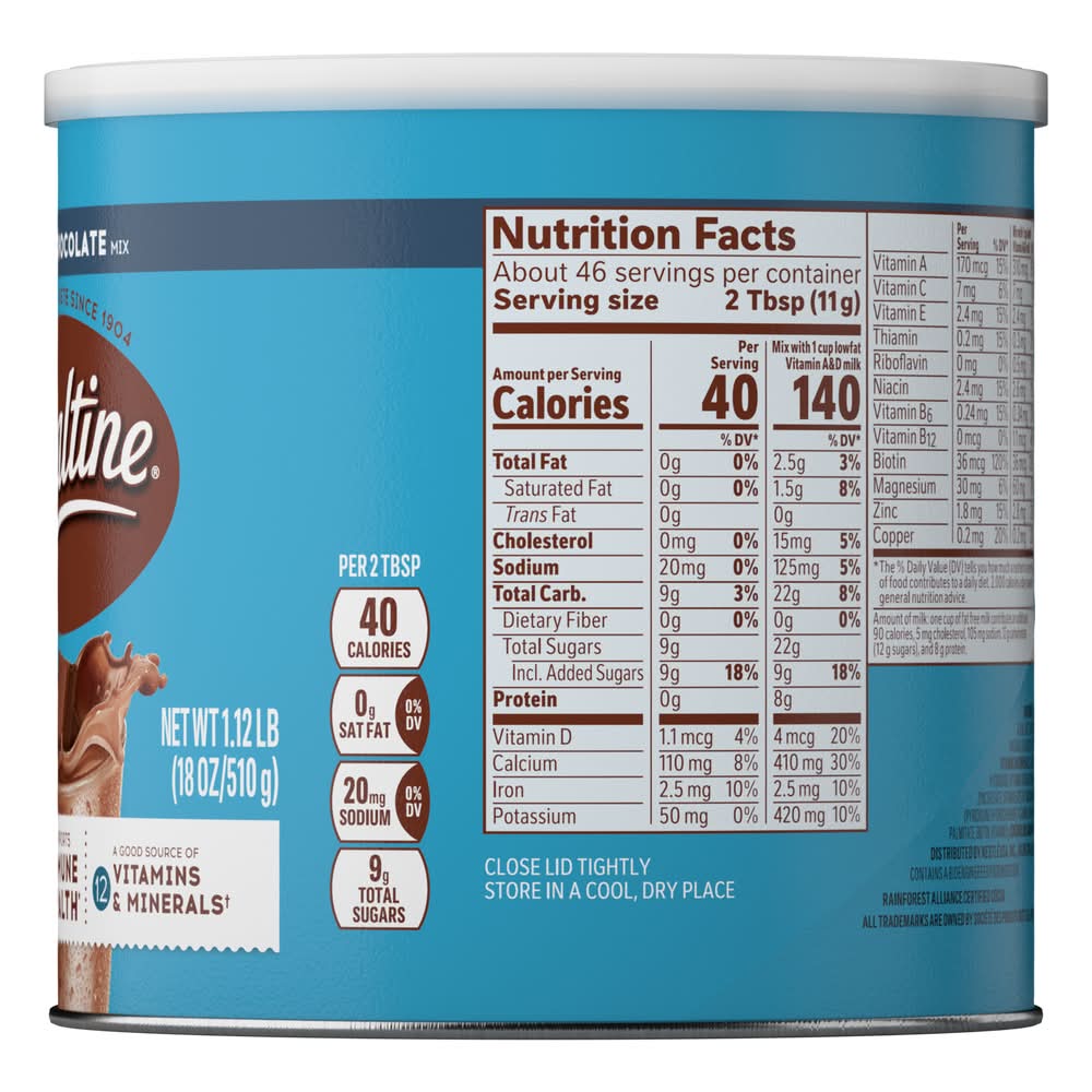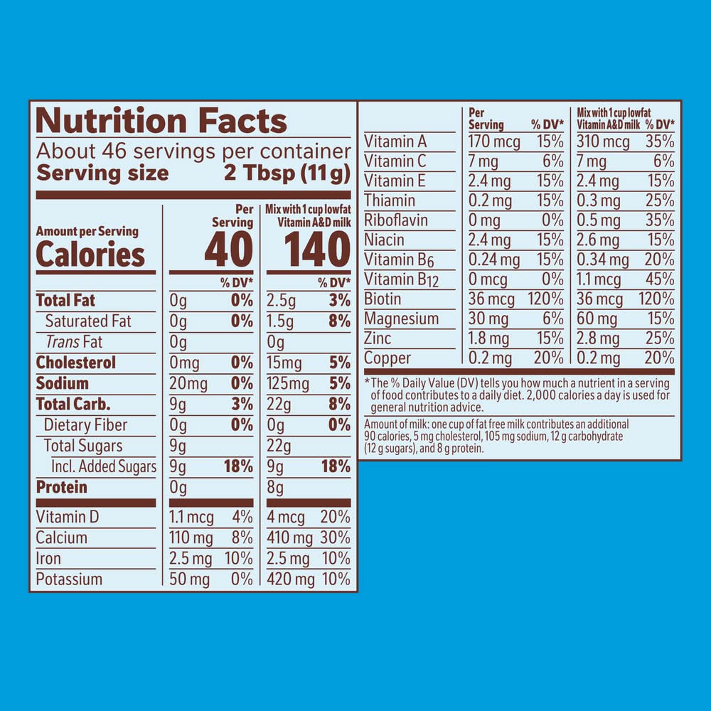 Make your milk work harder with Ovaltine Rich Chocolate Flavored Powdered Drink Mix. A classic addition to milk and plant based dairy, this powder drink mix gives milk a nostalgic chocolate milk taste. Ovaltine Rich Chocolate Mix is a good source of 12 vitamins and minerals per serving, including iron, zinc, Vitamins A, D and E, when prepared as directed. These vitamins and minerals are good additions to the diets of kids and adults alike. Additionally, this rich chocolate drink powder contains no artificial flavors or sweeteners. Rich Chocolate Ovaltine drink mix powder goes great in a cold glass of almond milk for a dairy-free chocolate milk or a warm mug of whole milk for a classic hot chocolate. It is also perfect as an ice cream topping. Use this powdered chocolate milk mix in smoothies and baked goods for a rich chocolatey taste. Ovaltine Rich Chocolate drink mix comes in an 18 ounce canister big enough to share and is shelf stable when stored in a cool dark place with the lid closed tightly. Chocolatey and yummy all in one, Ovaltine has a rich heritage as a trusted provider of great tasting, good for you deliciousness. • Flavor: Rich chocolate • Packaging: Reusable