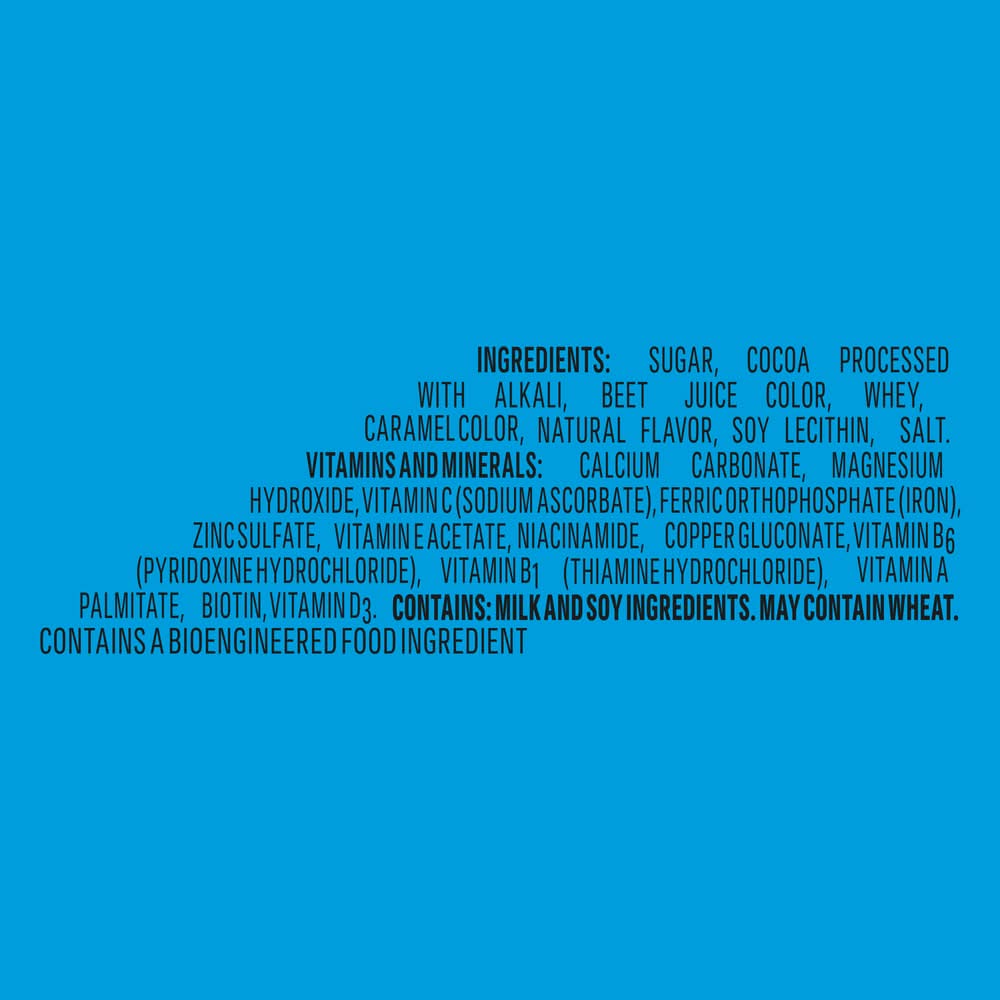 Ingredients: SUGAR, COCOA PROCESSED WITH ALKALI, BEET JUICE COLOR, WHEY, CARAMEL COLOR, NATURAL FLAVOR, SOY LECITHIN, SALT. VITAMINS AND MINERALS: CALCIUM CARBONATE, MAGNESIUM HYDROXIDE, VITAMIN C (SODIUM ASCORBATE), FERRIC ORTHOPHOSPHATE (IRON), ZINC SULFATE, VITAMIN E ACETATE, NIACINAMIDE, COPPER GLUCONATE, VITAMIN B6 (PYRIDOXINE HYDROCHLORIDE), VITAMIN B1 (THIAMINE HYDROCHLORIDE), VITAMIN A PALMITATE, BIOTIN, VITAMIN D3 Contains: Soyabeans, Milk, Wheat