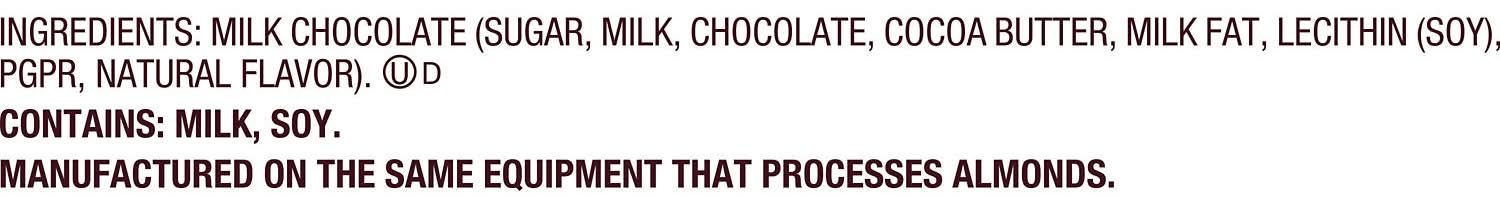 Ingredients: MILK CHOCOLATE, SUGAR, MILK, CHOCOLATE, COCOA BUTTER, MILK FAT, LECITHIN (SOY), PGPR, NATURAL FLAVOR, . Contains: Contains: Soy|Milk