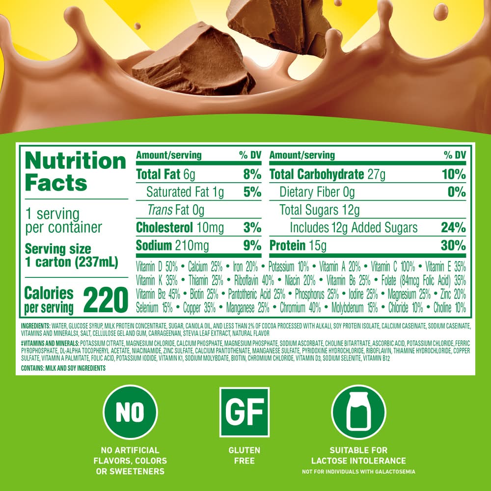 Ingredients: WATER, GLUCOSE SYRUP, MILK PROTEIN CONCENTRATE, SUGAR, CANOLA OIL, SOY PROTEIN ISOLATE, AND LESS THAN 2% OF COCOA PROCESSED WITH ALKALI, VITAMINS AND MINERALS*, SALT, CELLULOSE GEL AND GUM, NATURAL FLAVOR, CARRAGEENAN, STEVIA LEAF EXTRACT *VITAMINS AND MINERALS: POTASSIUM CITRATE, MAGNESIUM CHLORIDE, CALCIUM PHOSPHATE, MAGNESIUM PHOSPHATE, SODIUM ASCORBATE, CHOLINE BITARTRATE, ASCORBIC ACID, POTASSIUM CHLORIDE, DL-ALPHA TOCOPHERYL ACETATE, FERRIC PYROPHOSPHATE, NIACINAMIDE, ZINC SULFATE, CALCIUM PANTOTHENATE, MANGANESE SULFATE, PYRIDOXINE HYDROCHLORIDE, RIBOFLAVIN, THIAMINE HYDROCHLORIDE, COPPER SULFATE, VITAMIN A PALMITATE, FOLIC ACID, POTASSIUM IODIDE, VITAMIN K1, SODIUM MOLYBDATE, BIOTIN, CHROMIUM CHLORIDE, VITAMIN D3, SODIUM SELENITE, VITAMIN B12, (Insert Rainforest Alliance Logo), Cocoa, Rainforest Alliance Certified Cocoa. Find out more at ra.org. Contains: Contains Milk', 'Contains Soybeans'